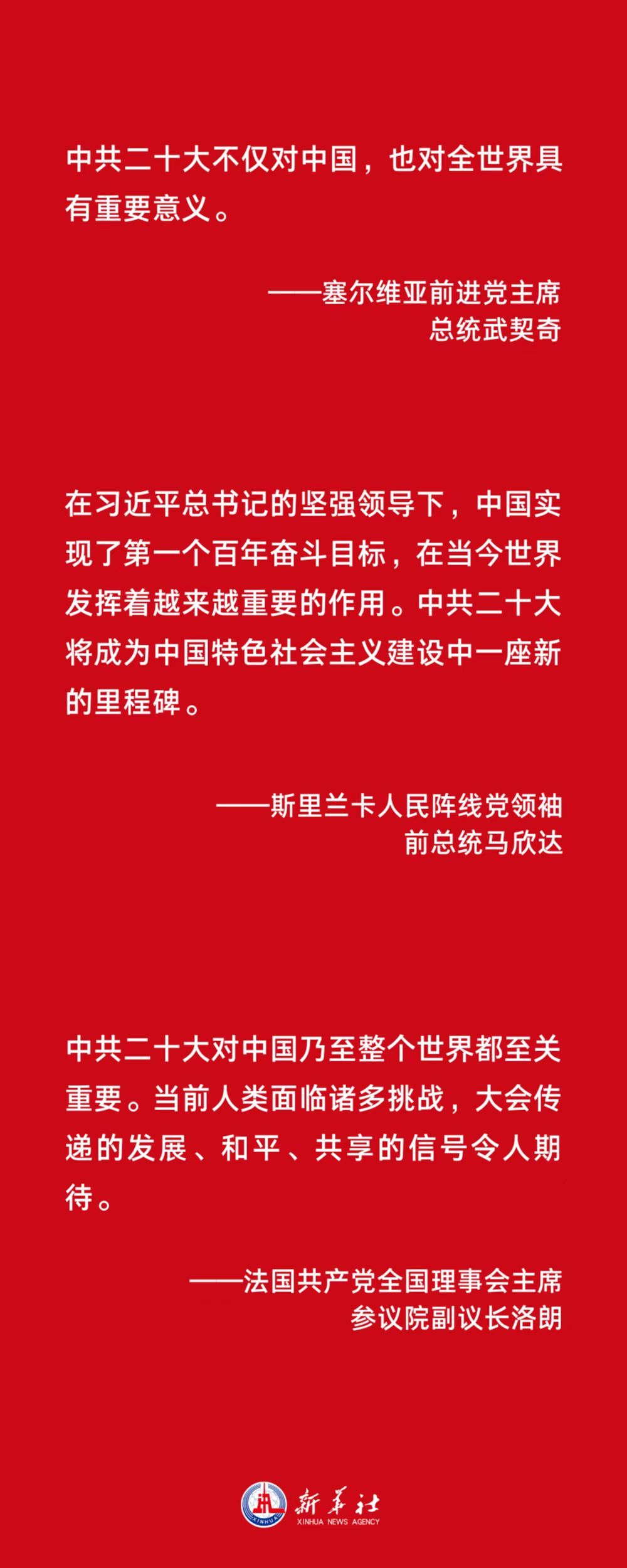 斯里兰卡人民阵线党领袖、前总统马欣达表示,在习近平总书记的坚强领导下,中国实现了第一个百年奋斗目标,在当今世界发挥着越来越重要的作用。中共二十大将成为中国特色社会主义建设中一座新的里程碑。