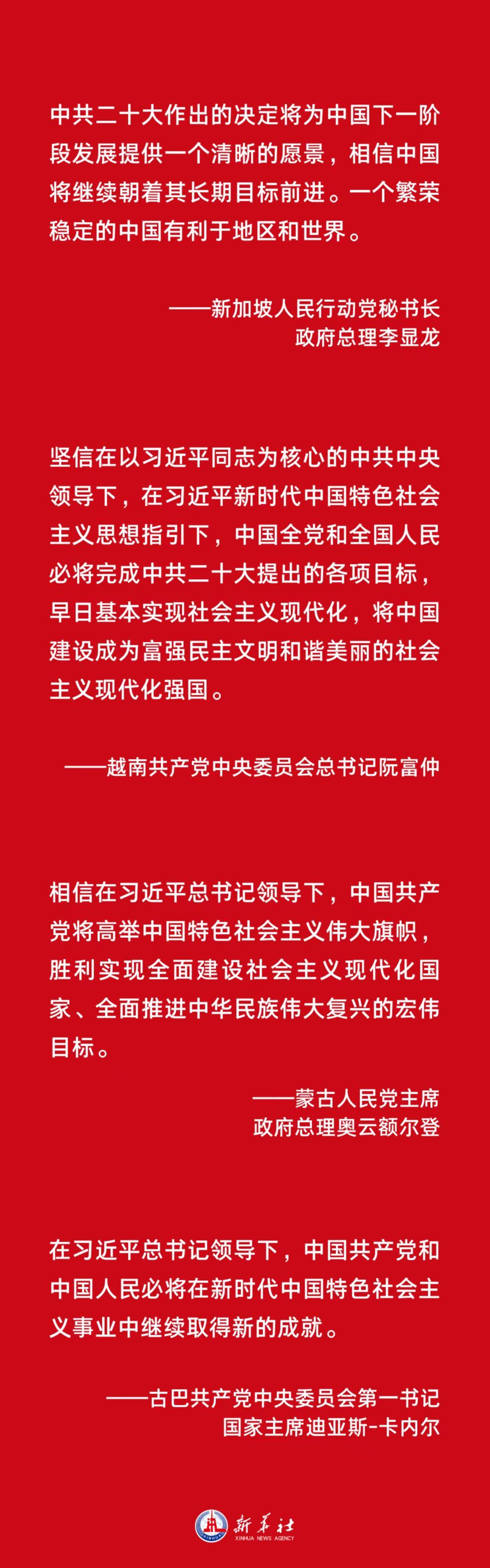 新加坡人民行动党秘书长、政府总理李显龙表示,中共二十大作出的决定将为中国下一阶段发展提供一个清晰的愿景,相信中国将继续朝着其长期目标前进。一个繁荣稳定的中国有利于地区和世界。