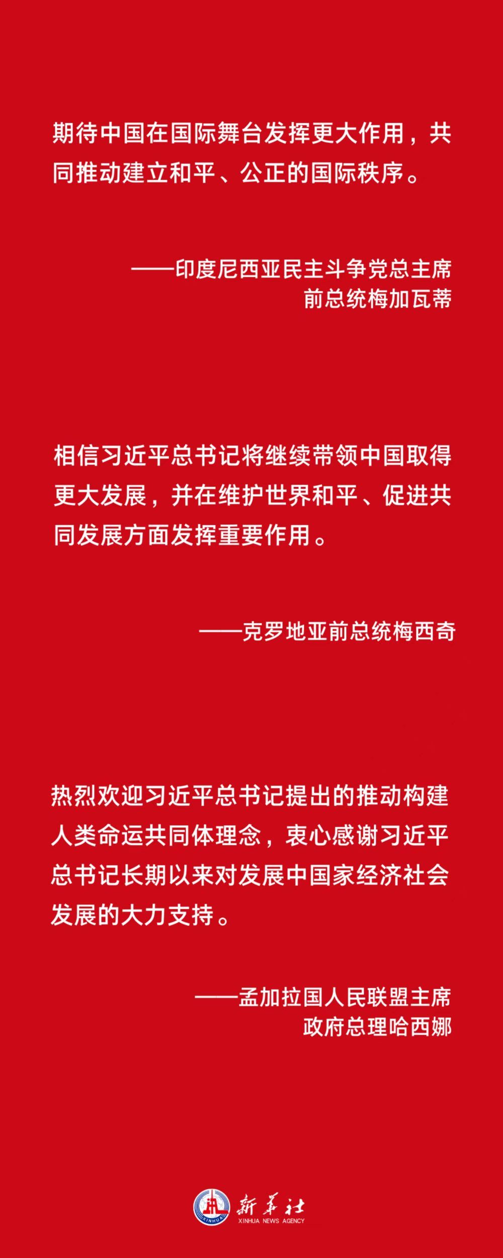 印度尼西亚民主斗争党总主席、前总统梅加瓦蒂表示,期待中国在国际舞台发挥更大作用,共同推动建立和平、公正的国际秩序。