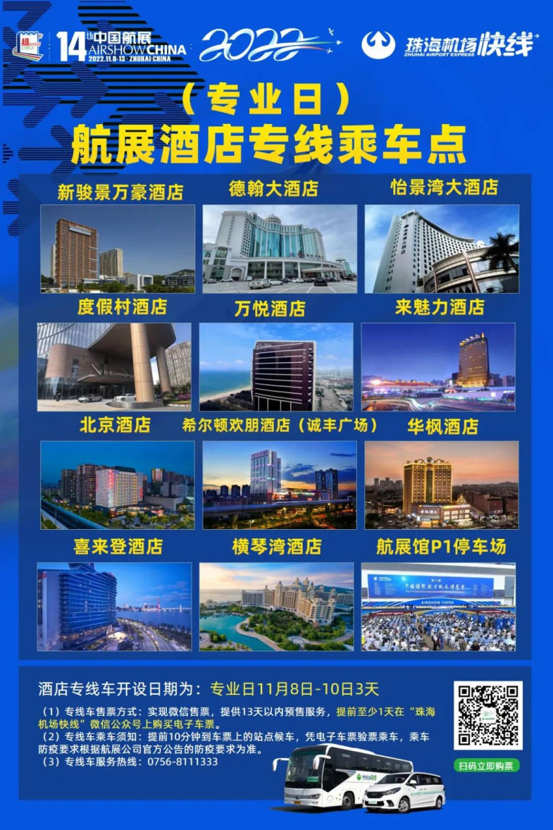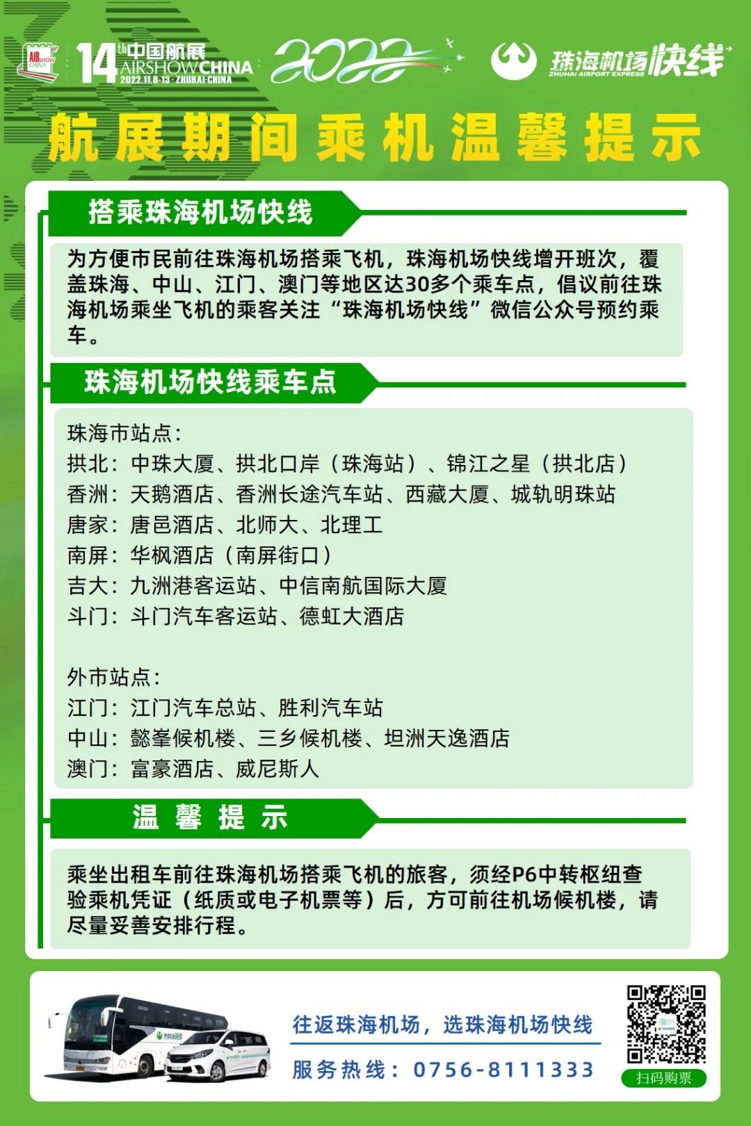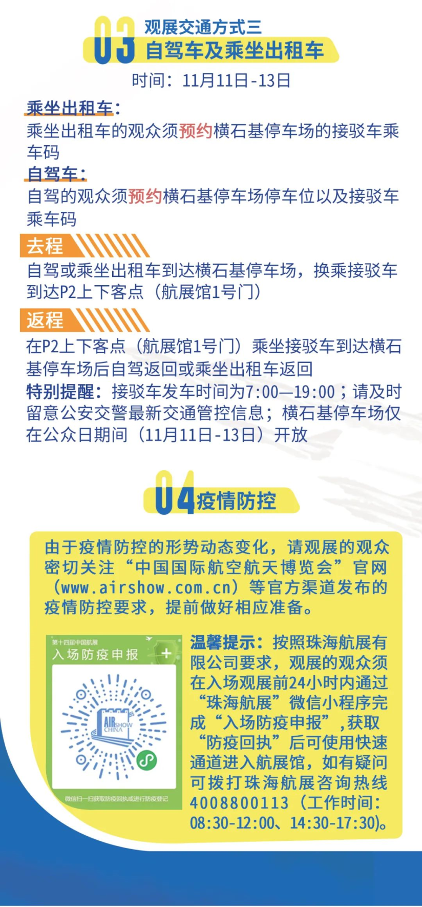 乘车途经:购票观众可凭航展门票在“珠海交通”微信公众号或“珠海交通”APP免费预约乘车码,提早预约,凭乘车码乘坐,更便捷。