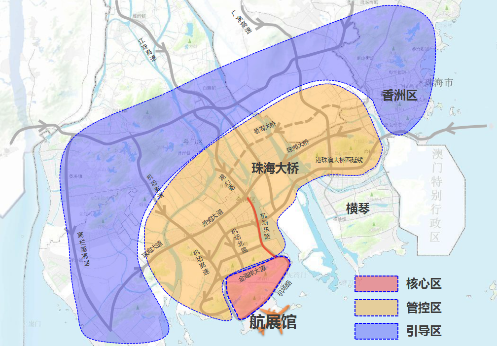 航展期间(11月8日至11月13日)每天早6点到晚20点,对机场东路(金湾路、金海东路)全段、金湾互通立交(禁止左转机场东路)实施交通管制,并对珠海大道、洪鹤大桥、鹤港高速、港珠澳大桥连接线实施7座以下(含)小型客车单双号限行措施(除警车、持航展车辆通行证车辆、大运量交通工具、巡游出租车、应急保障车辆外)。