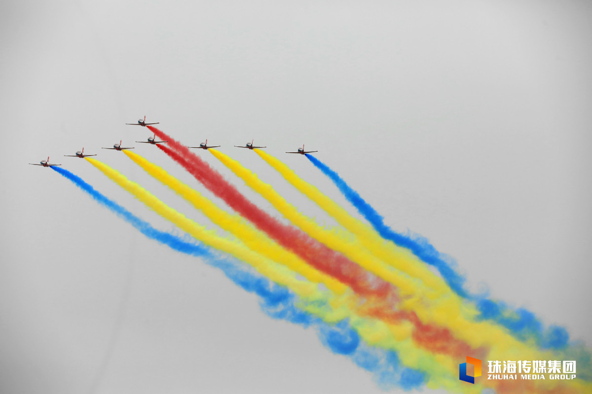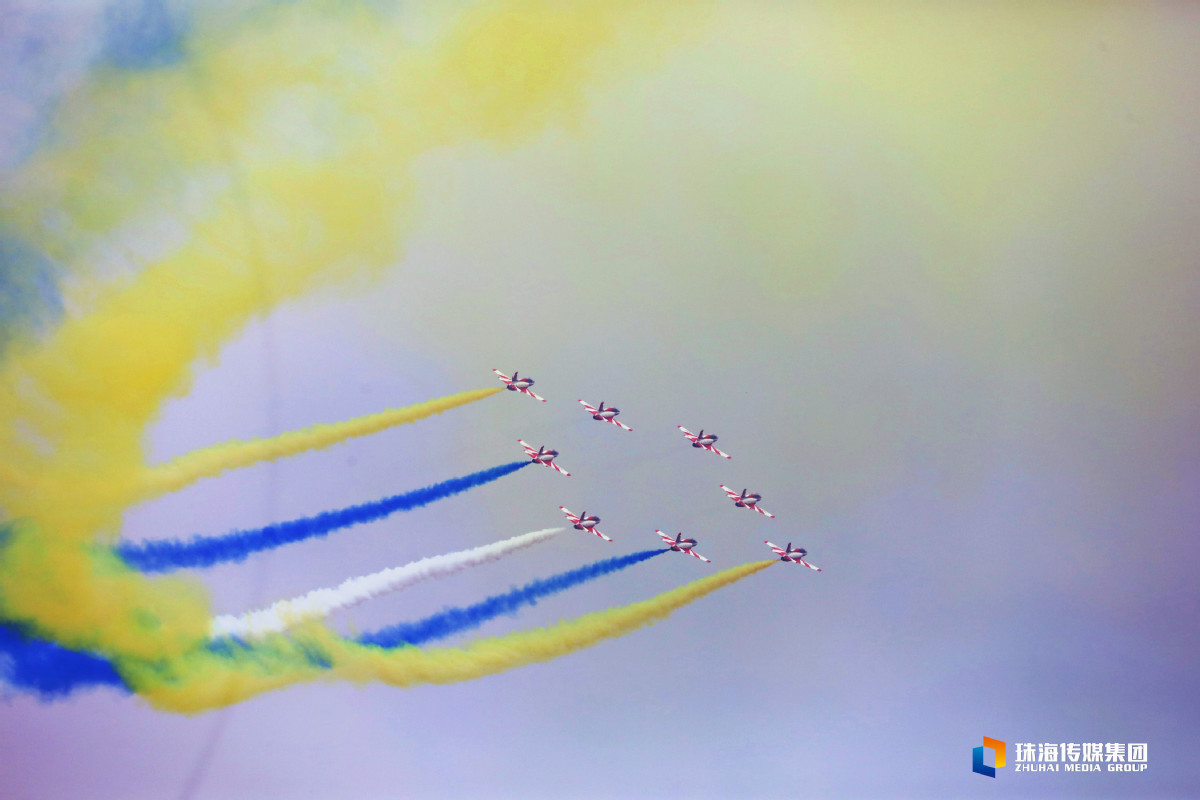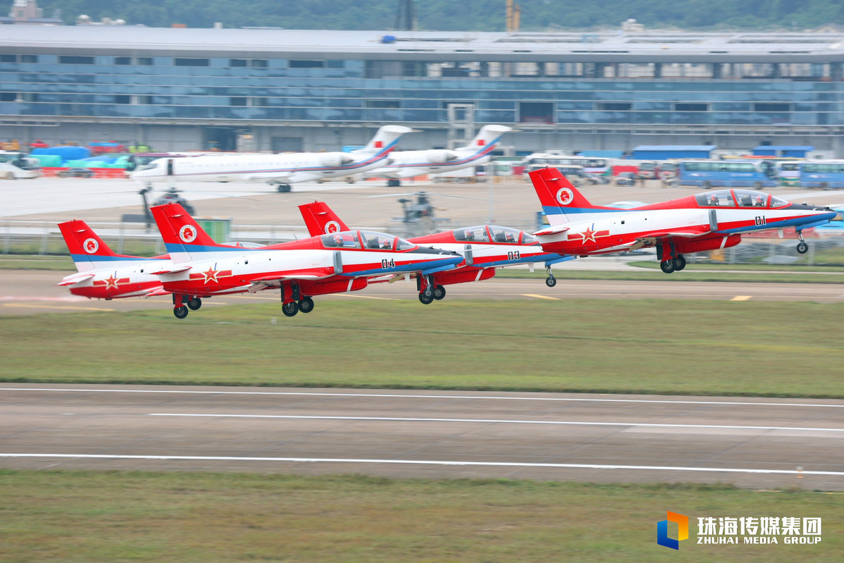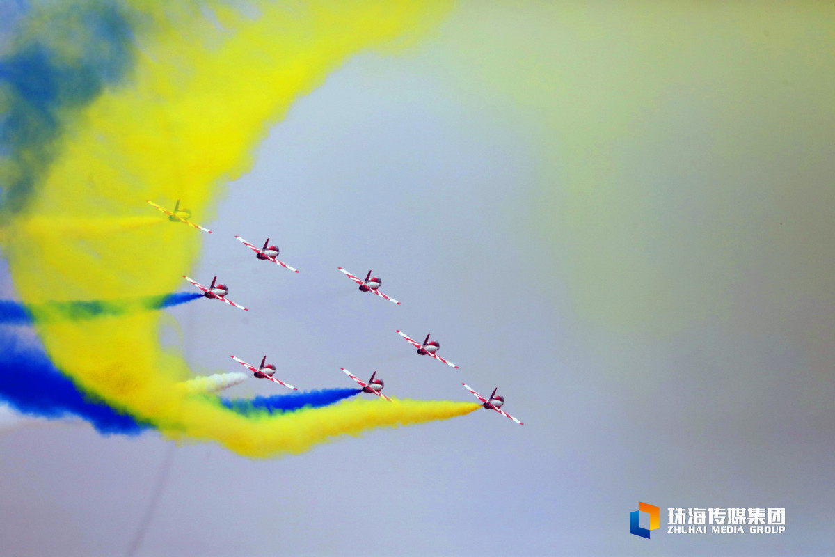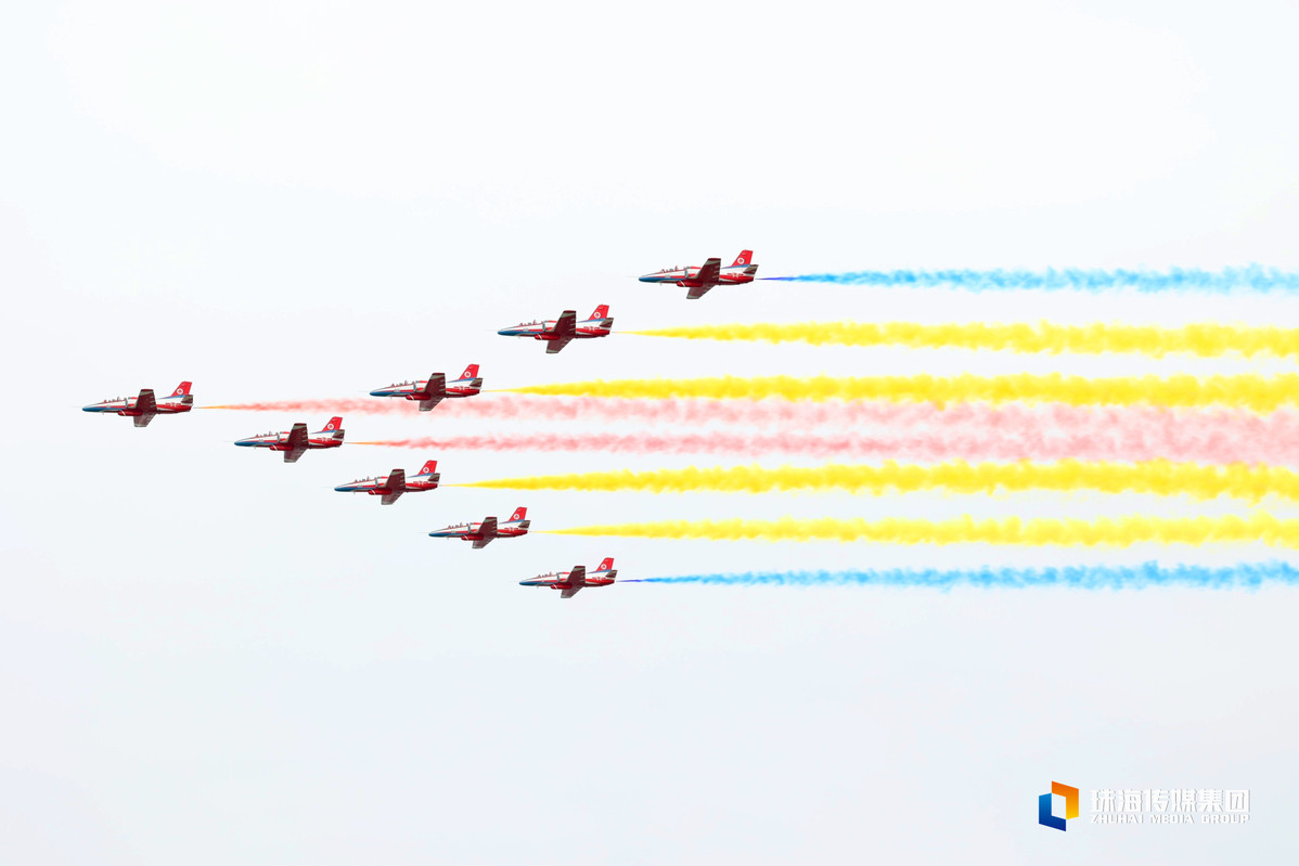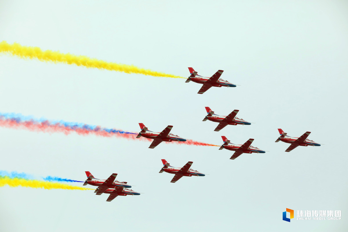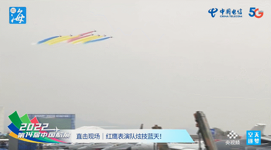今天是第十四届中国航展开幕第一天。中午1时许,红鹰飞行表演队八架飞机齐齐升空,在空中完成集结,炫技蓝天,搏击天空。