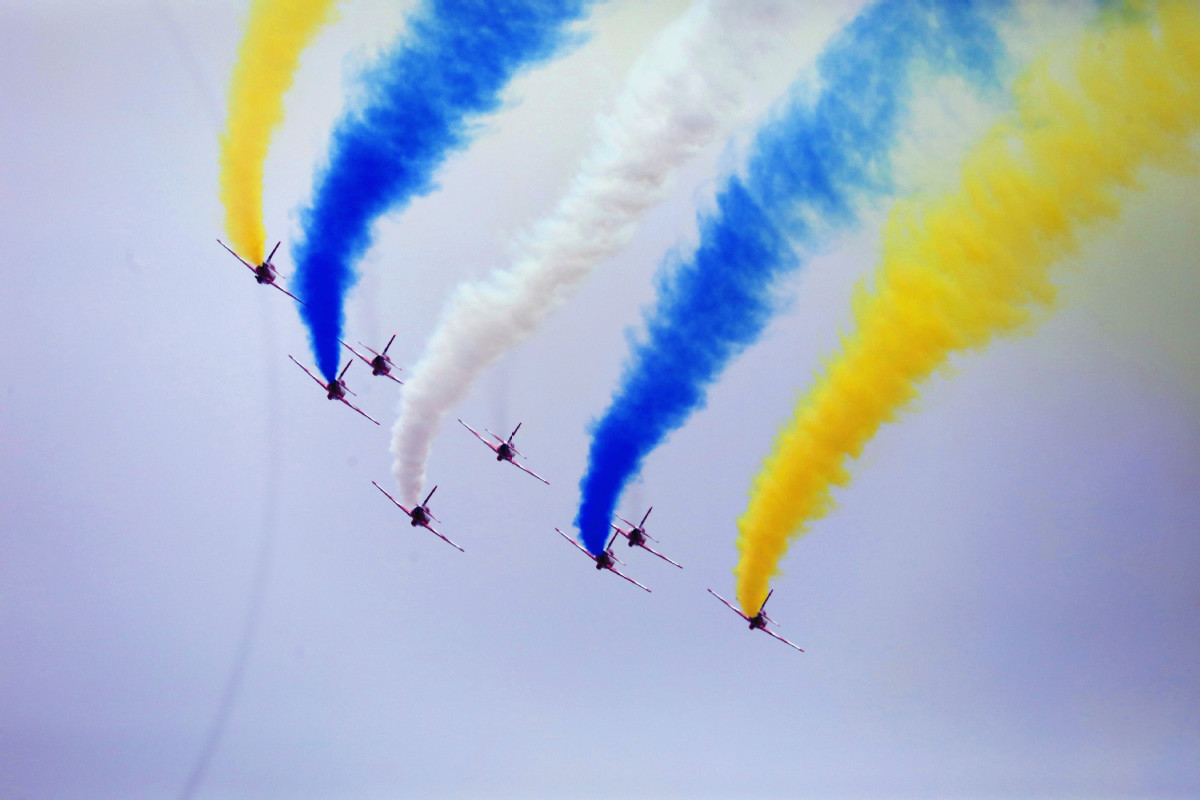 “红鹰”们拖着彩色烟带,宛如八只雄鹰在天空起舞,然后八架飞机变换队形成了标枪状的战斗姿态,再次在天空拉出烟带。