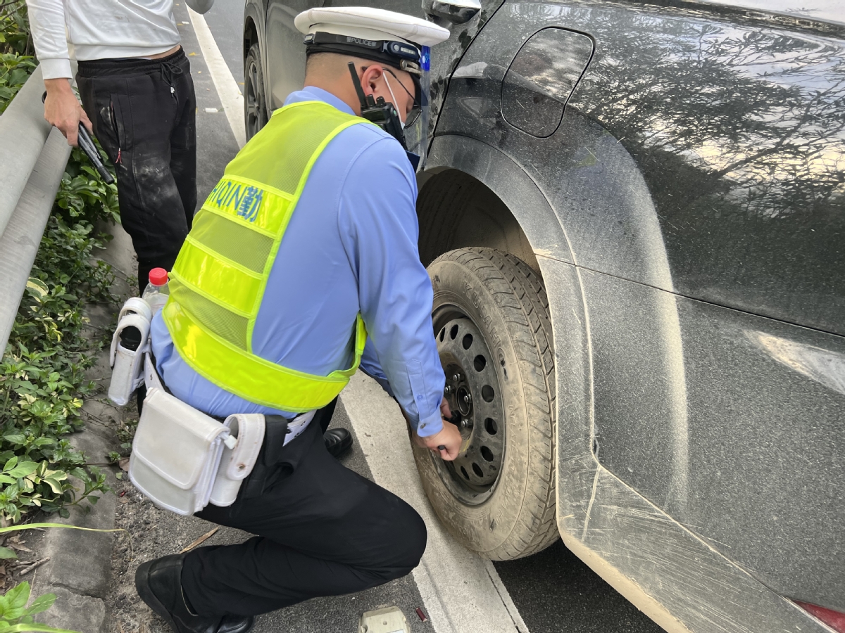 11月11日18时38分,高速公路交警大队何警官在西部沿海高速西往东11公里处巡逻时,发现一辆粤T3××85号红色别克小车停在应急车道,亮着双闪灯,何警官做好防护措施后上前查看。