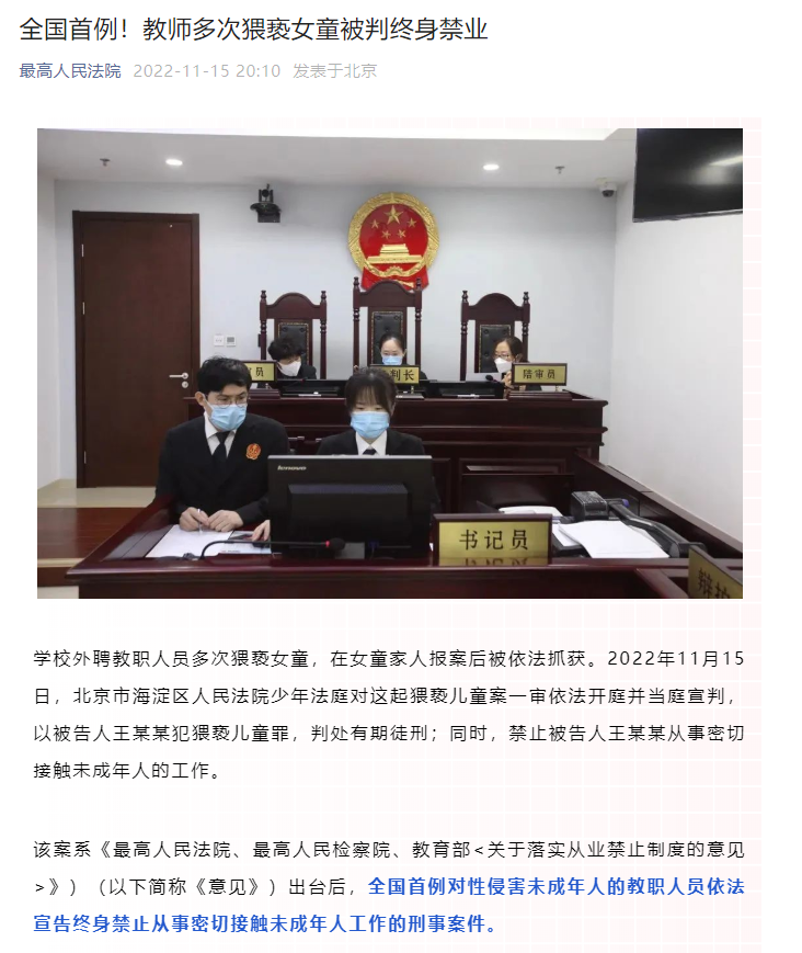 该案系《最高人民法院、最高人民检察院、教育部<关于落实从业禁止制度的意见>》)(以下简称《意见》)出台后,全国首例对性侵害未成年人的教职人员依法宣告终身禁止从事密切接触未成年人工作的刑事案件。