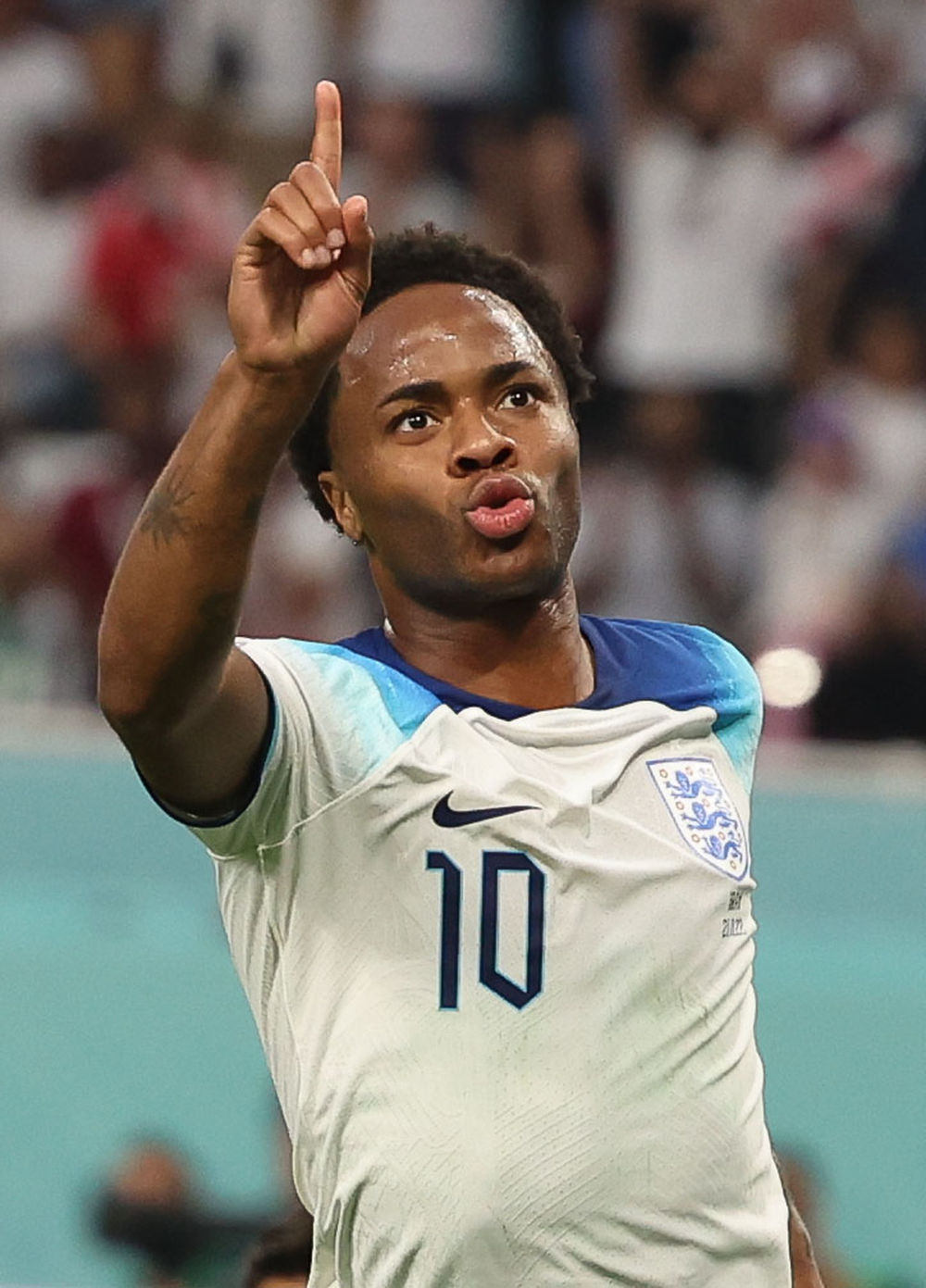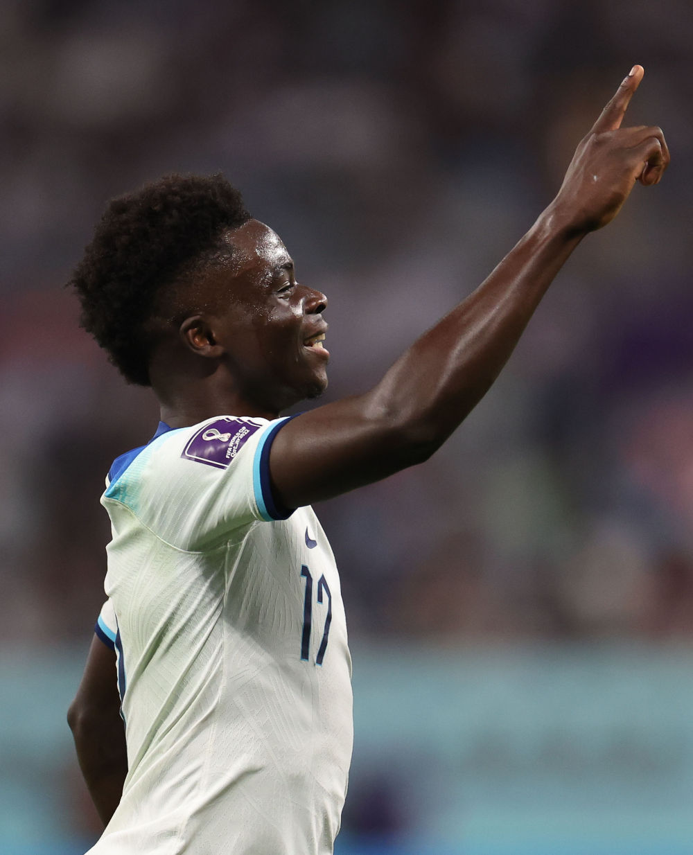 ↑英格兰队球员萨卡庆祝自己的第二粒进球。新华社记者 曹灿 摄