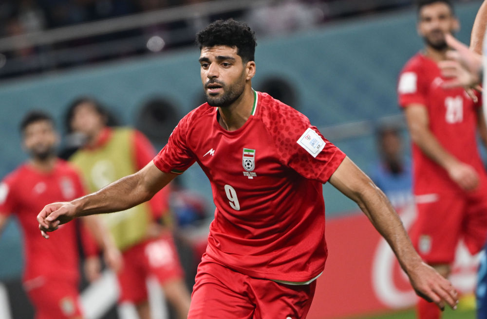 ↑伊朗队球员塔雷米庆祝进球。新华社记者 李尕 摄