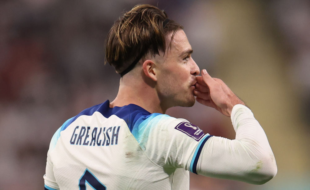 ↑英格兰队球员格拉利什(右二)破门得分。新华社记者 韩岩 摄