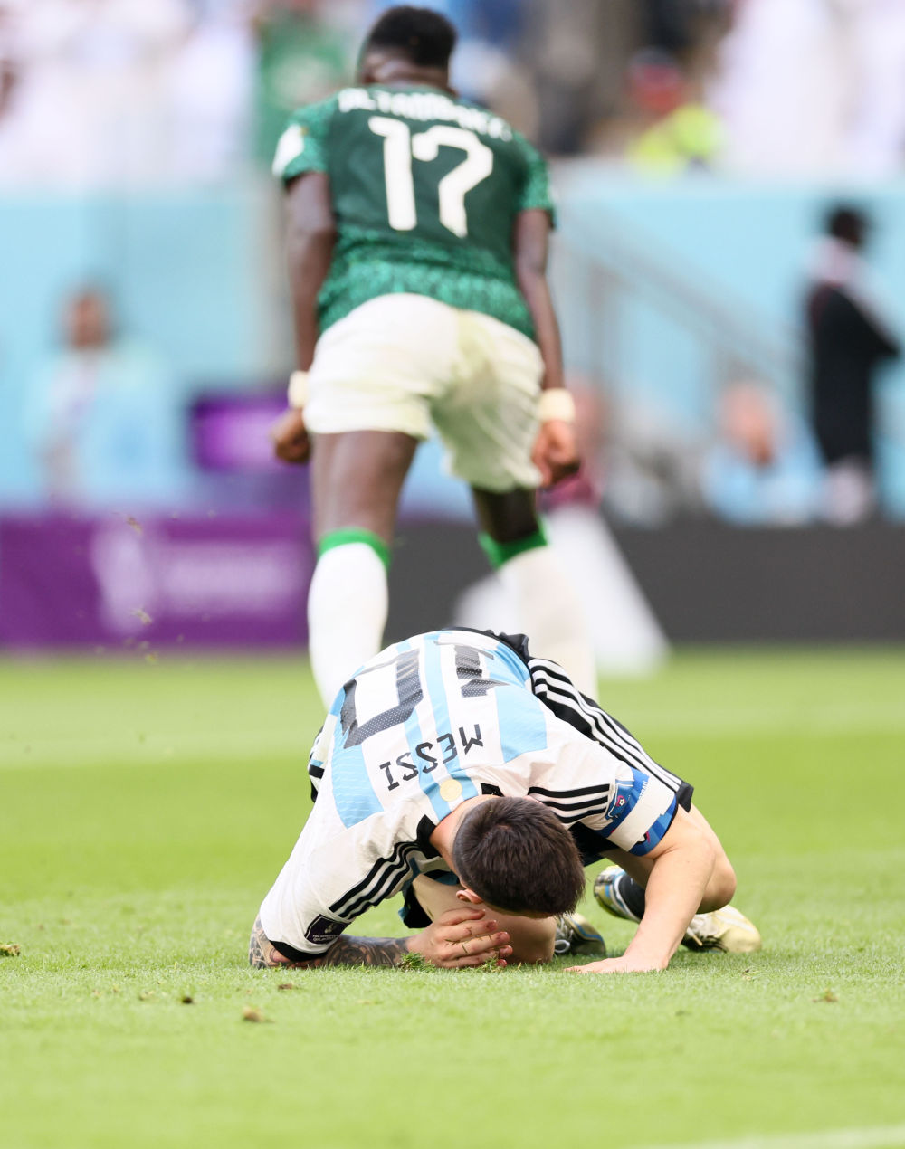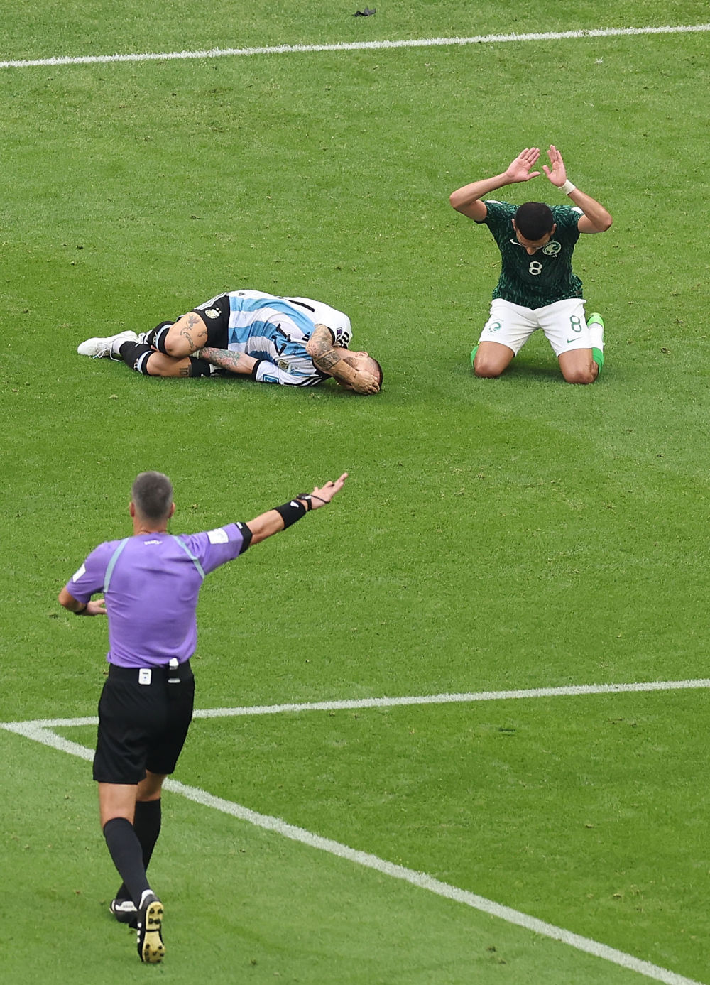 ↑阿根廷队球员亚历杭德罗·戈麦斯(左)被沙特阿拉伯队球员阿卜杜拉-马尔基犯规倒地。新华社记者 徐子鉴 摄