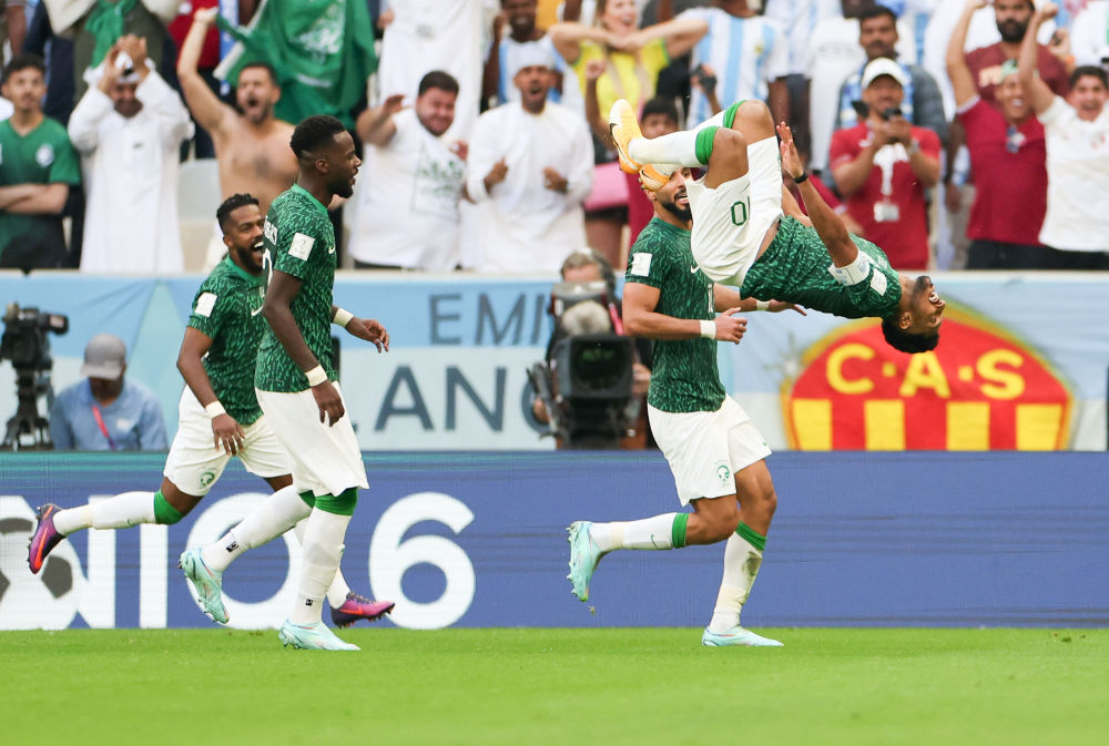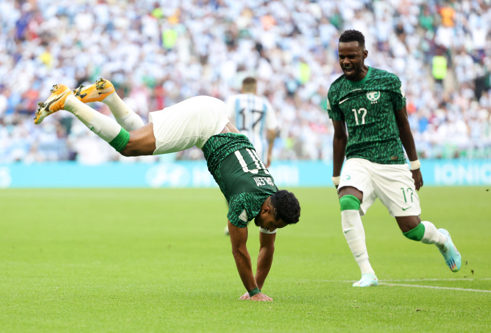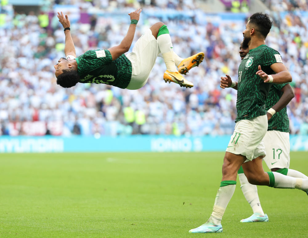 ↑沙特阿拉伯队球员萨勒姆-达瓦萨里(前)在打入球队第二粒进球后庆祝。新华社记者 徐子鉴 摄