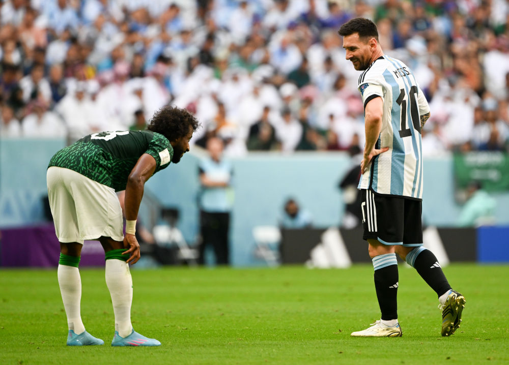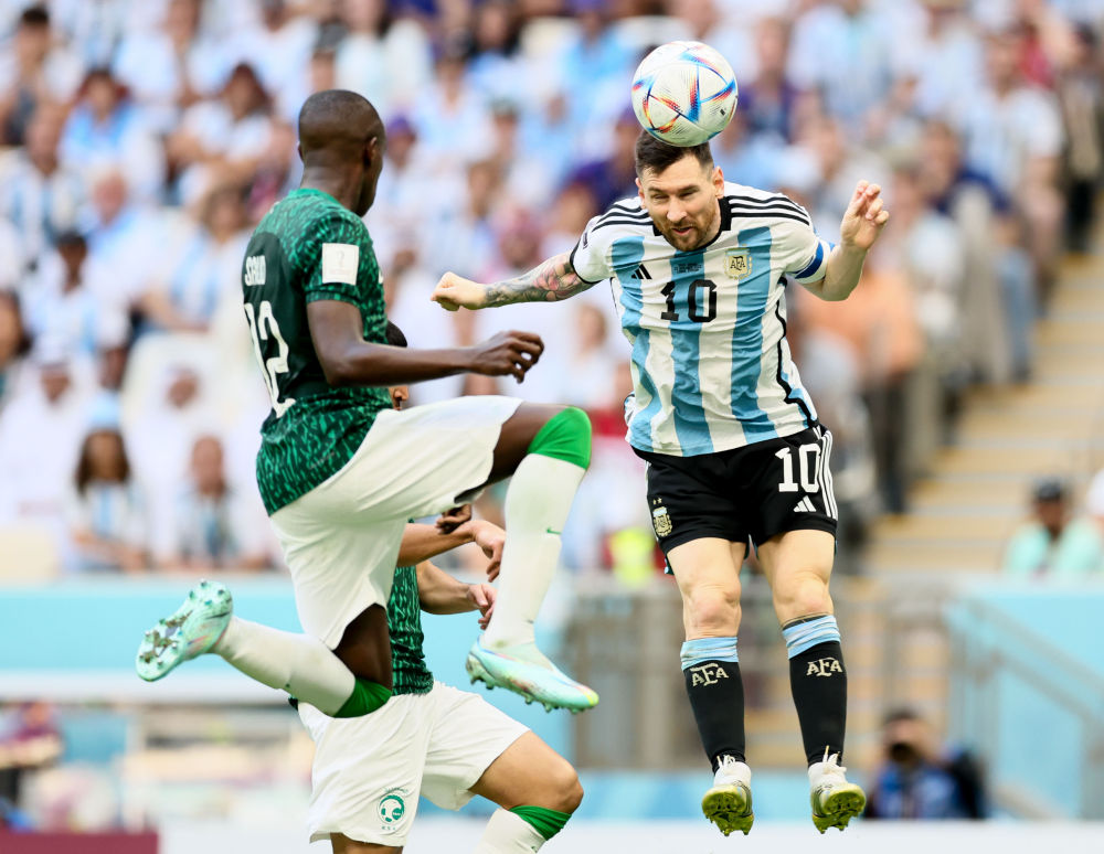 ↑11月22日,阿根廷队球员梅西(中)与沙特阿拉伯队球员萨勒姆-达瓦萨里(右)拼抢。新华社记者 兰红光 摄