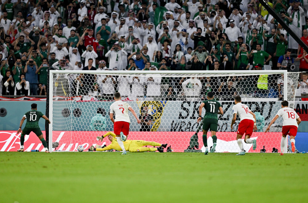 激烈的对抗导致频频有队员倒地,仅仅20分钟内裁判就掏出4张黄牌。僵持的局面被波兰队率先打破,第39分钟,泽林斯基接到莱万的底线回传,一脚推射破门。仅仅5分钟后,沙特队员在禁区内被放倒,裁判在观看VAR回放后判罚点球,关键时刻,什琴斯尼展现“门神”本色,他先是扑出达瓦萨里的点球,随后又将布莱克的补射拒之门外,帮助波兰队化解危机。