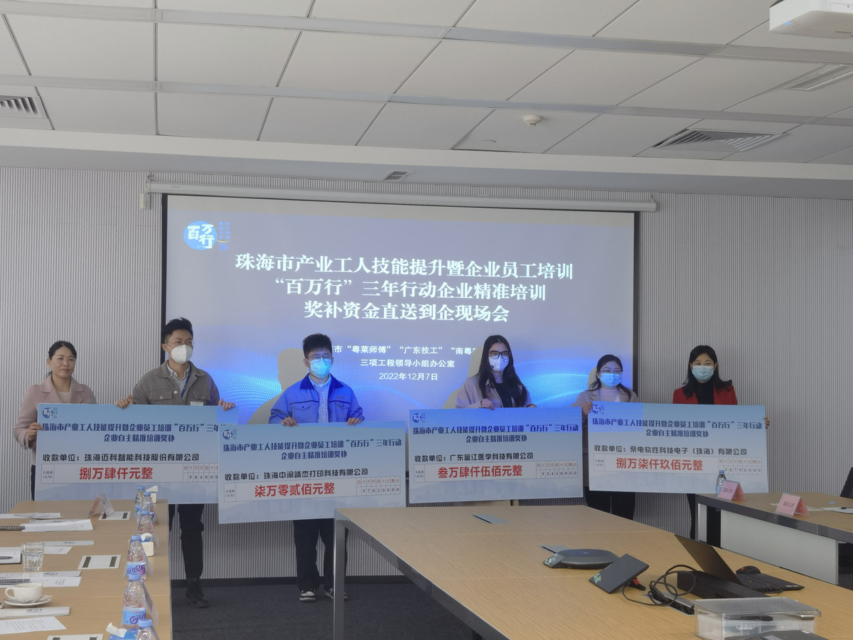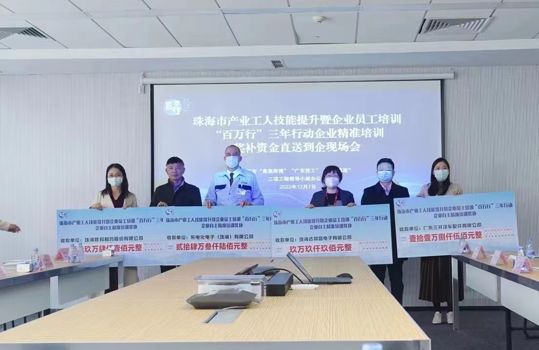 2022年,市政府先后出台《珠海市中小企业员工培训“百万行”三年行动方案(2022-2024年)》《珠海市产业工人技能提升暨企业员工培训“百万行”三年行动(2022-2024年)实施方案》。《行动方案》提出,2022—2024年,面向包括中小企业在内的全市企业(含个体工商户、社会组织等各类市场主体),由财政资金支持,对经营管理人员、技术骨干、产业工人、在建项目施工一线工人等各类员工进行一轮全覆盖业务培训,累计组织开展100场以上师资培训、1000场以上进企业示范性培训,累计培训产业工人100万人以上,其中2022年培训30万人以上。《行动方案》明确,重点实施普法宣传和政策宣讲进企业培训、安全生产和质量管理进企业培训、经营管理人员和技术骨干培训、技能提升和新生代产业工人培训、新业态从业者和全民数字技能培训等五大工程。