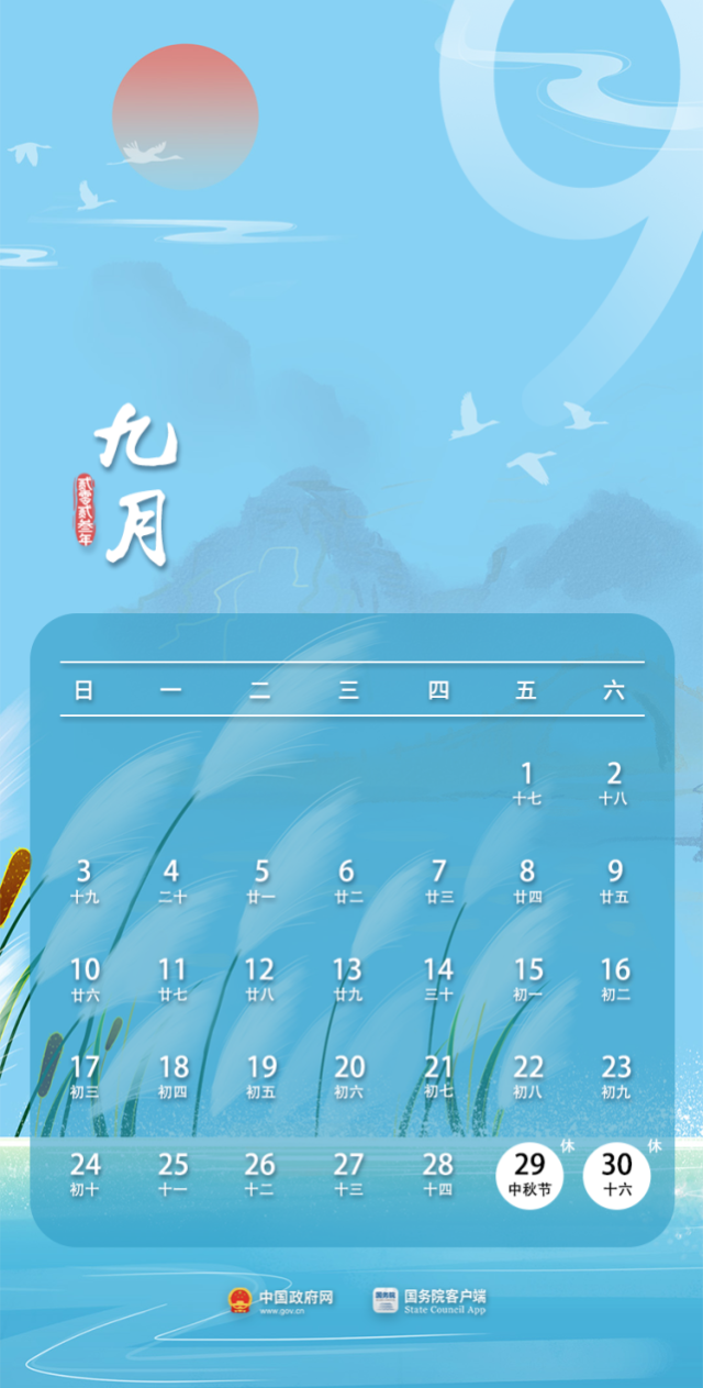 六、中秋节、国庆节:9月29日至10月6日放假调休,共8天。10月7日(星期六)、10月8日(星期日)上班。