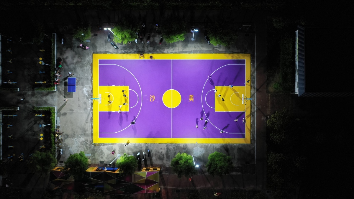 沙美文体公园篮球场上比拼正酣,亮眼的彩色球场颇受年轻人的青睐。