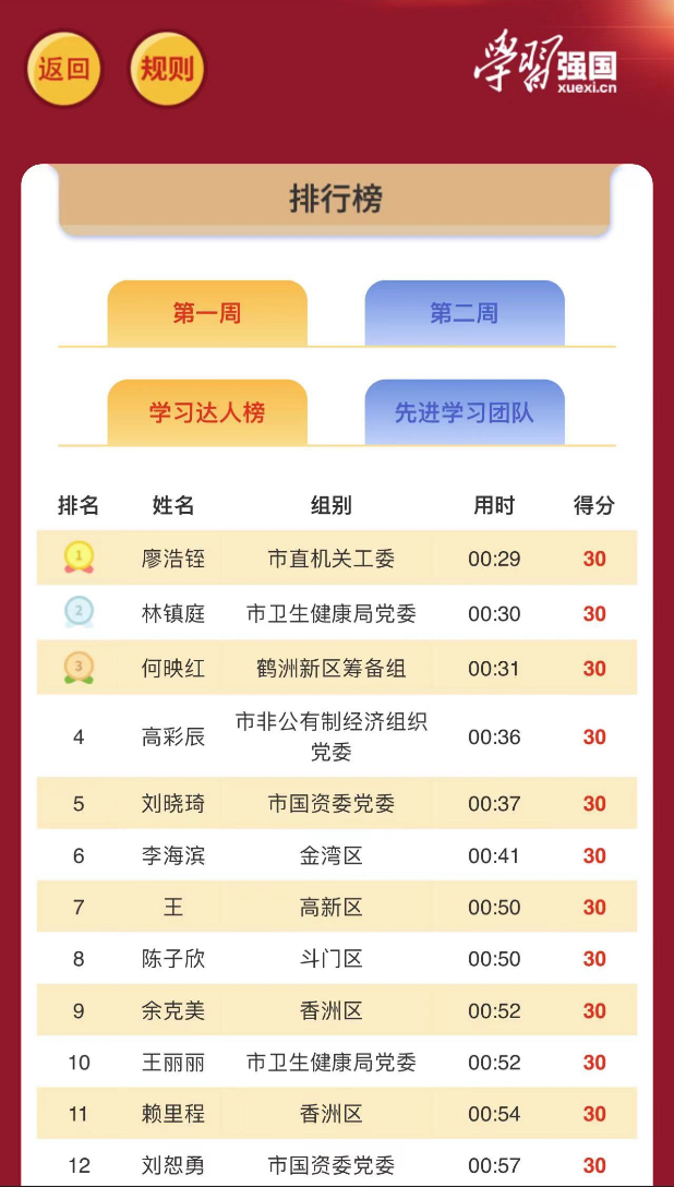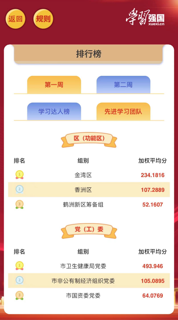 综合各区、各单位参与率和答题正确率,第一场周赛中获得第一名的区、党(工)委和个人分别为金湾区、市卫生健康局党委和来自市直机关工委的廖浩铚,他们也由此登上了先进学习团队榜和学习达人榜。