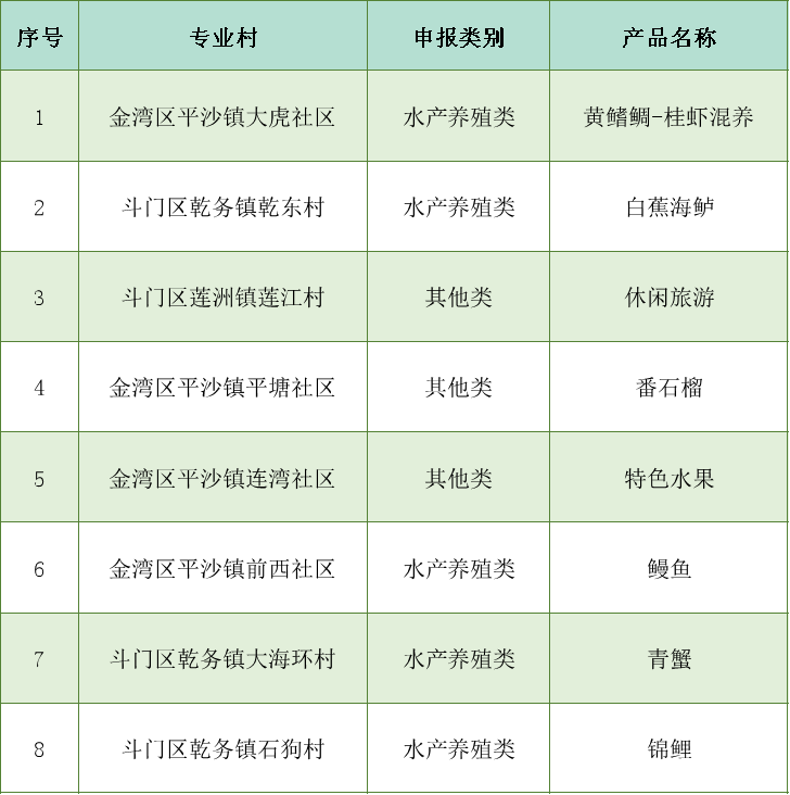 此外,金湾区平沙镇大虎社区、前西社区因黄鳍鲷-桂虾混养、鳗鱼产品被认定专业村;斗门区乾务镇大海环村、石狗村因青蟹、锦鲤产品被认定专业村;平沙镇平塘社区、连湾社区因番石榴、特色水果被认定专业村。