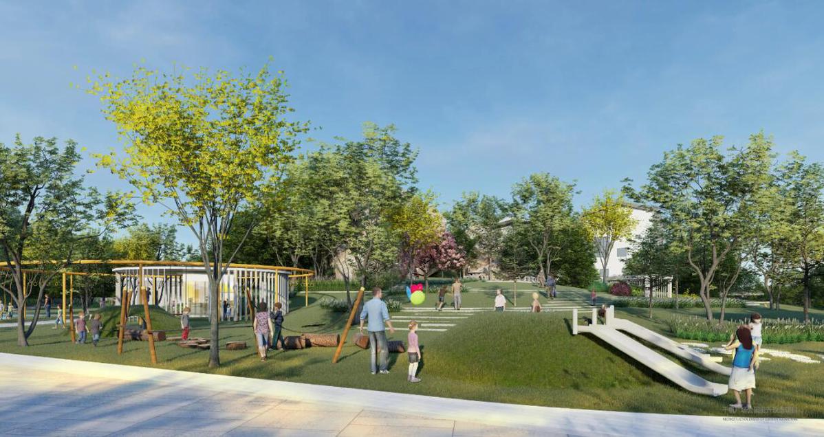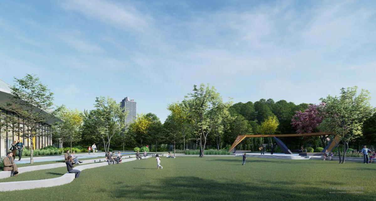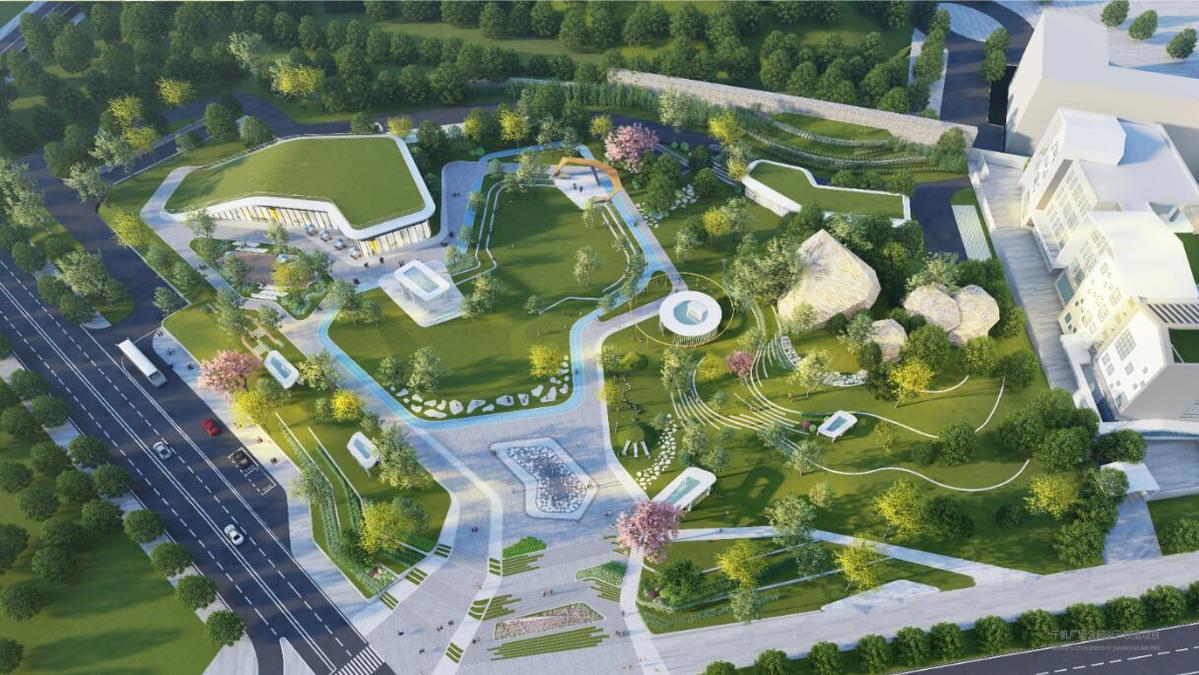 作为连接景山道的公园广场,落座于城市脉络的山水之间,地面公园设计基于建筑风格做了景观的延展性,使得景观与建筑更加整体统一,将构建山水一色的绿色基盘,打造弹性的蓝绿生境系统,通过对水绿生态系统的交织和对大地的景观塑造,为城市和自然构建友好的共生关系。