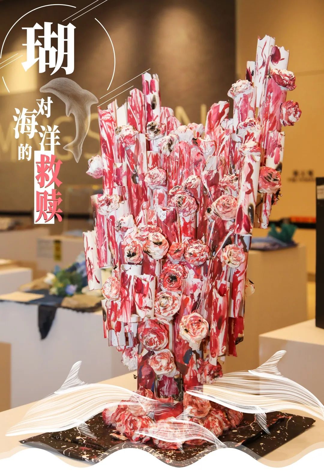 作品《瑚》中心是以玫瑰制作的珊瑚状心脏原型,通过核废水事件警戒人们,许多海洋生物都正在像这些玫瑰一样枯萎,像伤口一样溃烂。表达一种对海洋的救赎。