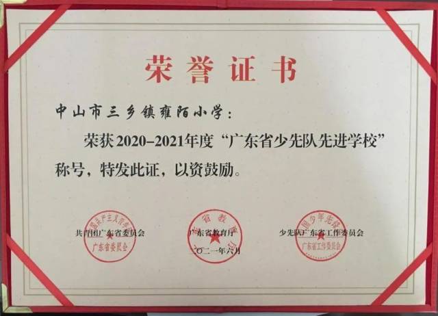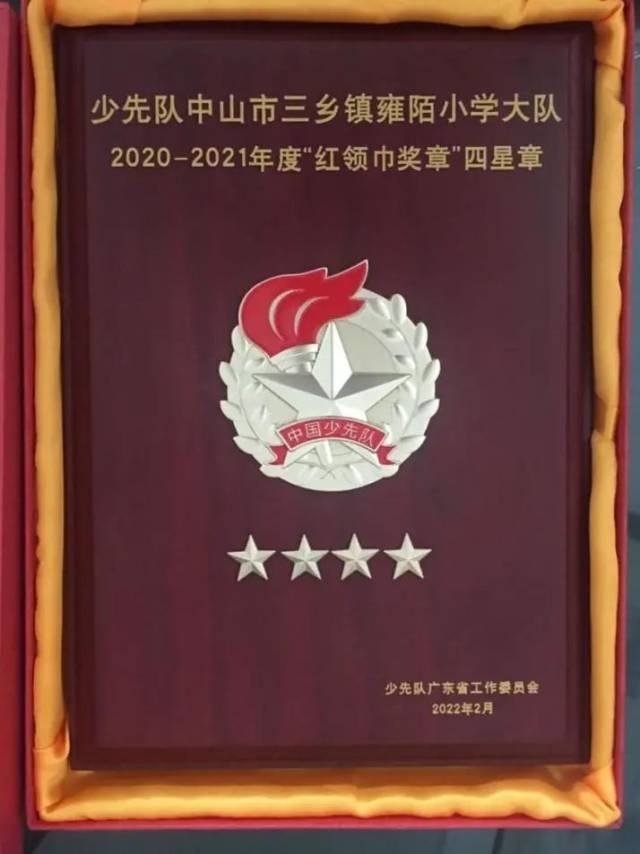 雍陌小学少先队开展“2022年度全国优秀少先队集体”的创建工作,经过紧张的筹备与逐层申报,最终脱颖而出,被共青团中央、教育部和全国少工委授予“2022年度全国优秀少先队集体”称号。期间,雍陌小学在2021年被评为“中山市少先队工作先进学校”和“广东省少先队先进学校”,在2022年获广东省“红领巾奖章”四星章。