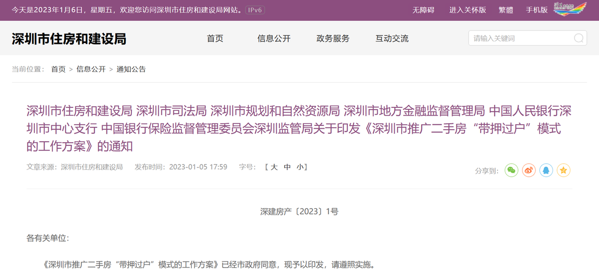 据深圳市住房和城乡建设局网站消息,为探索推广二手房“带押过户”模式,提高深圳市二手房交易效率和便利度,降低二手房交易成本,深圳市住房和建设局等六部门于1月5日联合下发关于印发《深圳市推广二手房“带押过户”模式的工作方案》(以下简称《工作方案》)的通知。