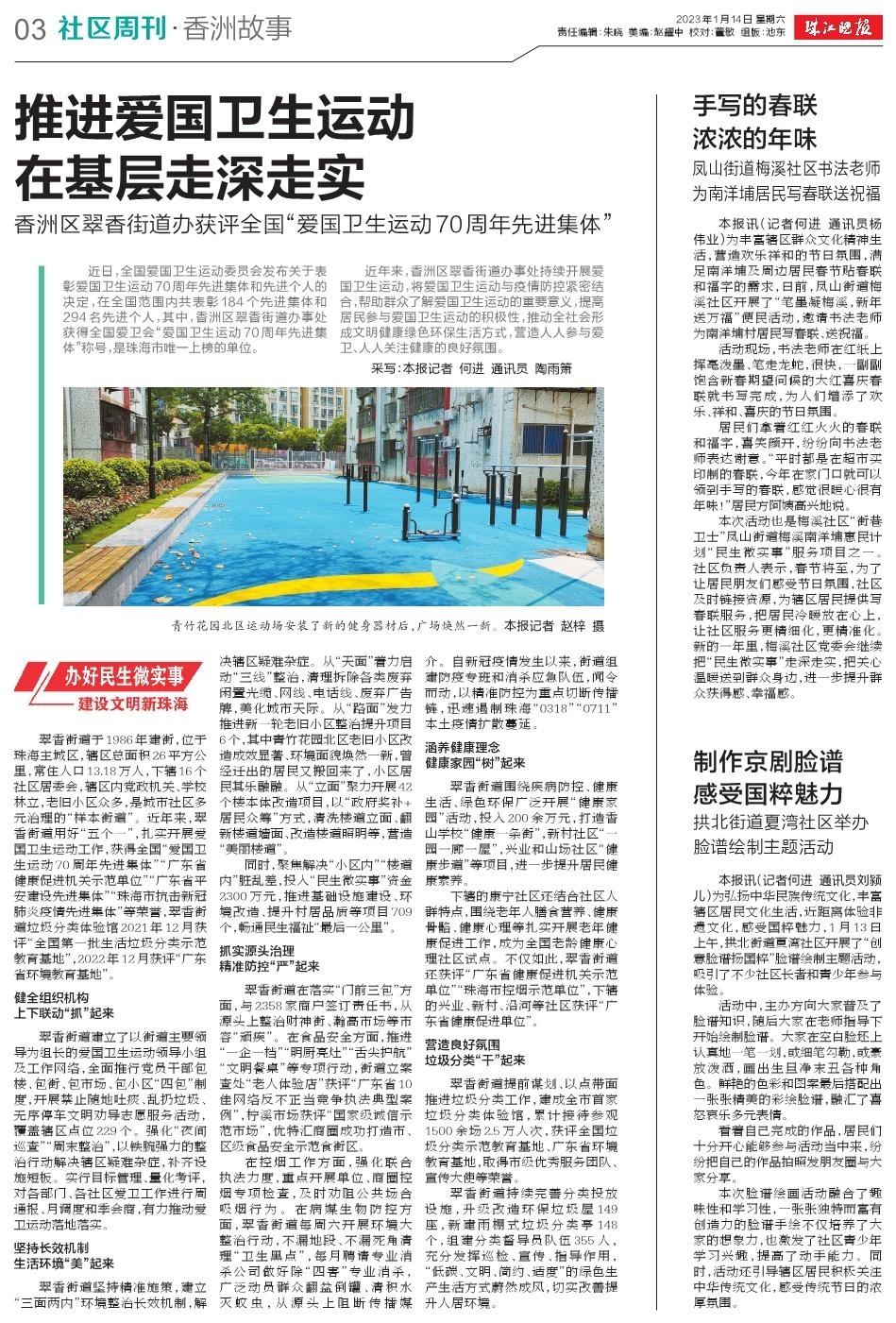 近年来,香洲区翠香街道办事处持续开展爱国卫生运动,将爱国卫生运动与疫情防控紧密结合,帮助群众了解爱国卫生运动的重要意义,提高居民参与爱国卫生运动的积极性,推动全社会形成文明健康绿色环保生活方式,营造人人参与爱卫、人人关注健康的良好氛围。