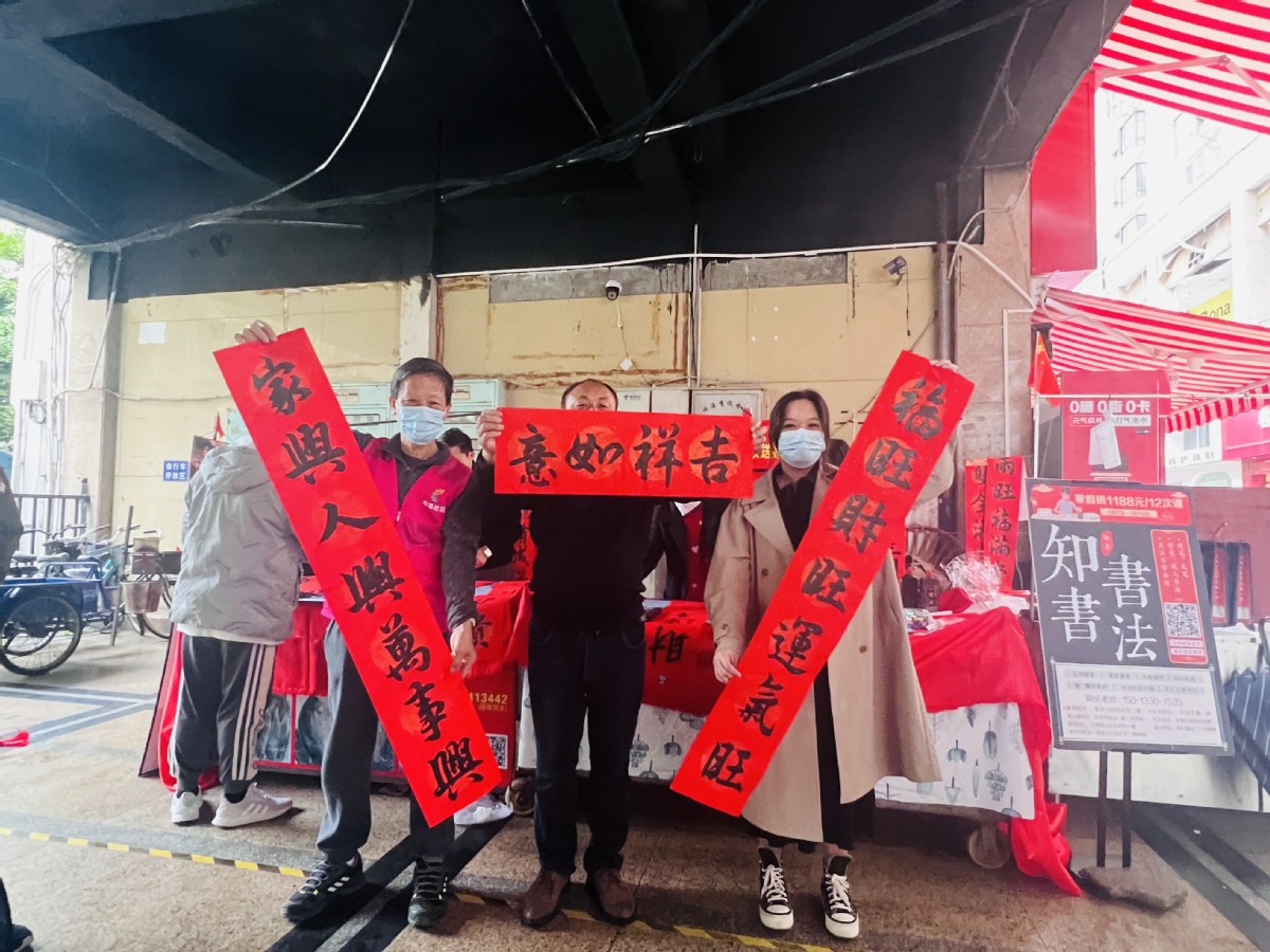活动现场,退役军人和书法老师们饱含热情,铺纸研墨、即席挥毫、笔走龙蛇,一起一落间,一幅幅苍劲有力、喜庆洋溢、满载美好祝愿的春联跃然纸上。78岁的赖训迳是一名退役军人,日常热爱书法,这是他连续第4年主动参与社区挥春送福活动,只见他大笔一挥,“虎躯羊去人康泰,兔送财来岁吉祥”运笔如飞,字字刚劲有力。一副副书法春联吸引群众,大家收到大红春联,十分开心。