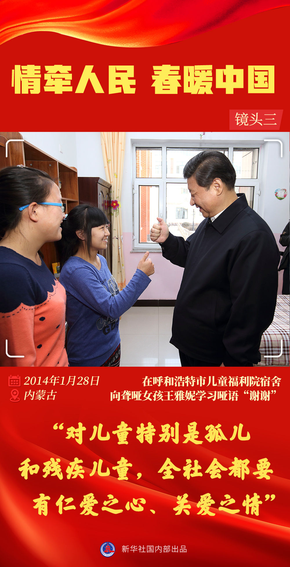在呼和浩特市儿童福利院里,习近平总书记鼓励聋哑女孩王雅妮好好学习,学业有成。王雅妮向习近平总书记弯了弯大拇指,用哑语表示“谢谢”。总书记笑容可掬地伸出手跟着学:“伸大拇指是‘好’,弯一弯是‘谢谢’。”温情与关爱盈满斗室。