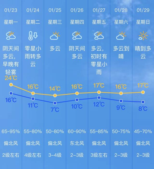 预计受其影响,24日(年初三),中山市零星小雨转多云,气温下降,北风加大至4-5级,阵风6-8级,平均气温降幅6-8℃,过程最低气温约7℃(将出现在25日年初四早晨);