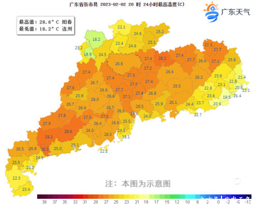 天气实况:2日白天到3日早晨,我省大部分市县晴到多云转阴天,2日白天阳江阳春录得全省最高气温28.6℃。