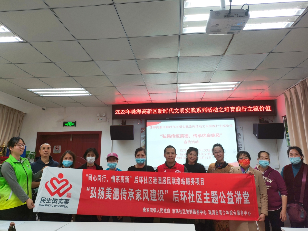 优良家风是中华民族传统美德的现代传承,为弘扬优秀传统文化,加强家庭道德文化建设,培育文明和谐家风,促进辖区港澳居民对传统文化的深入了解,2月17日,在唐家湾镇后环社区党群服务中心指导下,珠海市青少年综合服务中心开展了“弘扬美德 传承家风”后环社区主题公益讲堂。