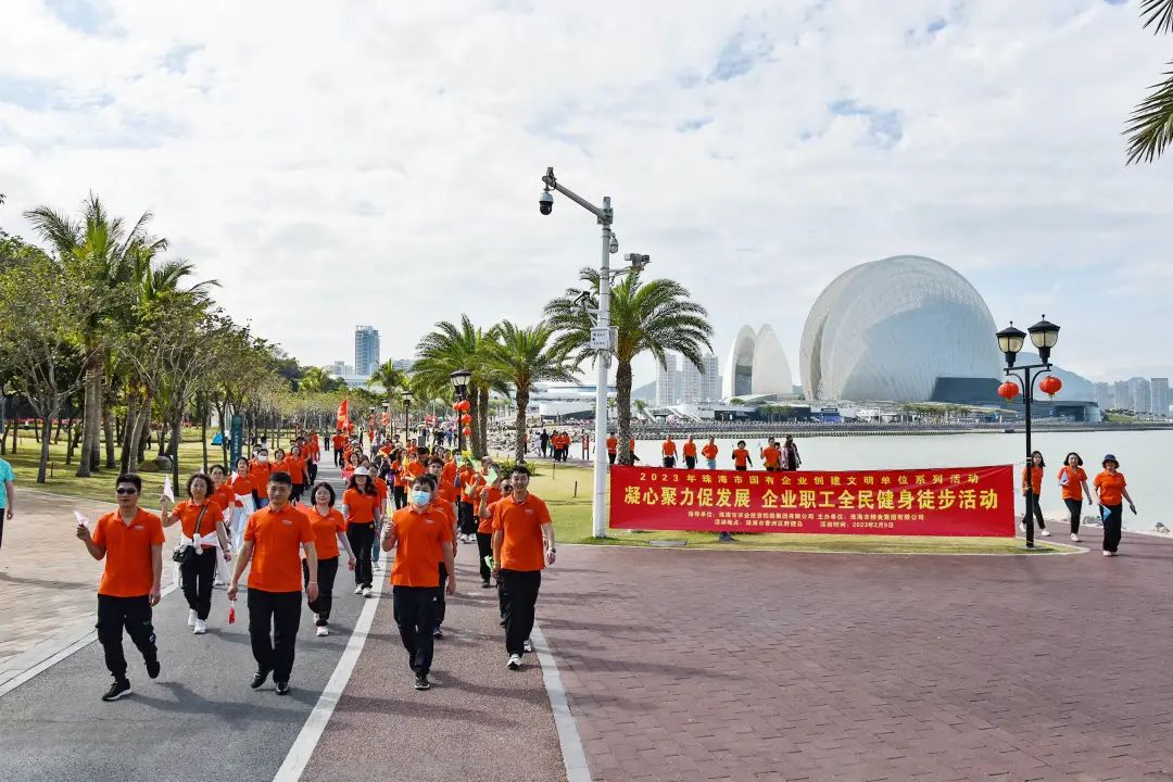 参与徒步活动的员工身着橙色队服,统一从野狸岛公园入口出发,顺利完成2.5公里徒步,到达活动终点珠海大剧院。一路上,徒步队伍昂首阔步,用脚步丈量野狸岛的美丽风光,沿途感受绿道美景,大口呼吸清新空气,充分享受户外活动带来的身心愉悦。