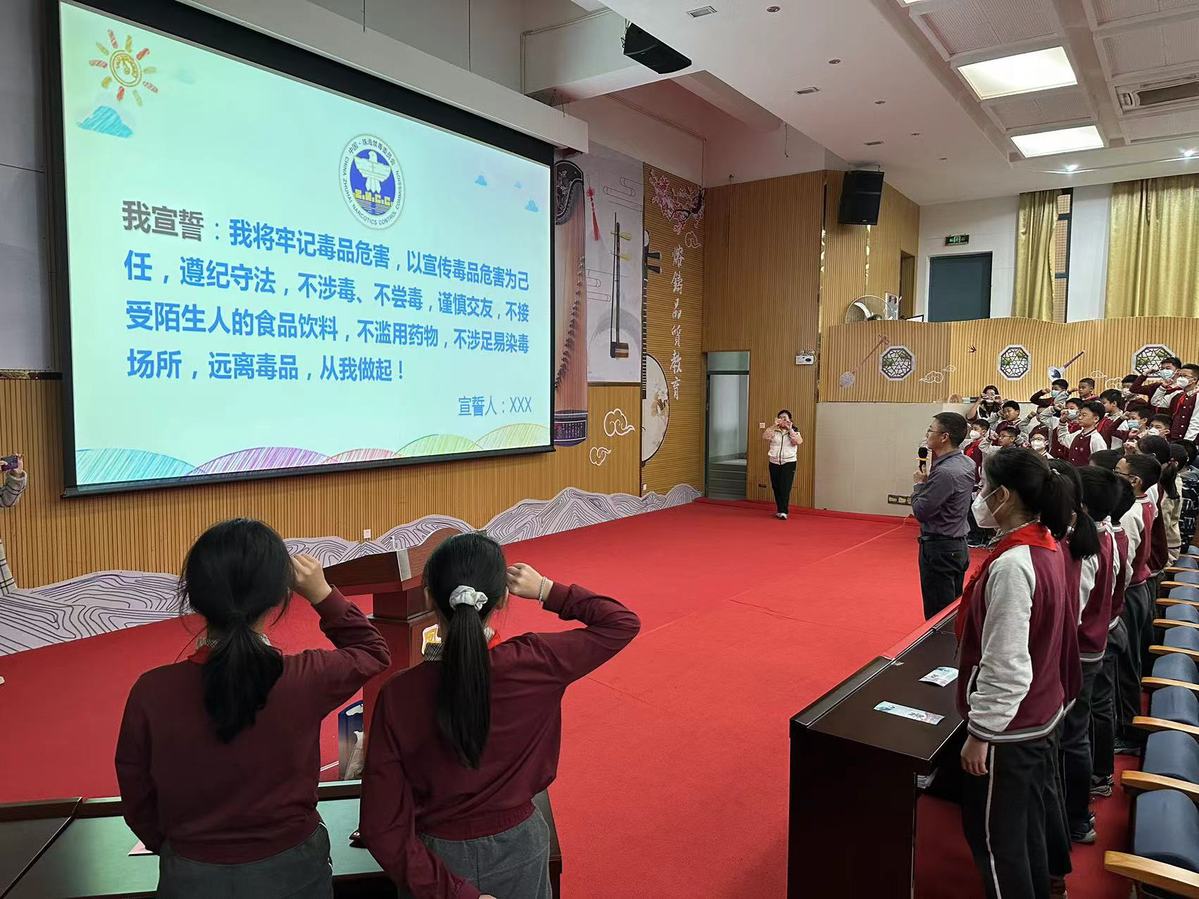 活动伊始,街道禁毒专干向每位同学派发禁毒宣传小册子,让同学们通过阅读更加直观了解毒品的相关知识。随后珠海市第二强制隔离戒毒所禁毒讲师彭德泉开展专题知识讲座。彭讲师结合多媒体讲义、教学道具模型和实际案例向同学们生动且详细的讲解了毒品的基本知识、毒品的危害性、青少年吸毒的原因及青少年如何防范毒品,大大激发起了同学们的学习热情,踊跃参与问答互动,营造了良好的学习气氛。讲座的尾声,彭讲师带领全体师生宣读了禁毒誓词。