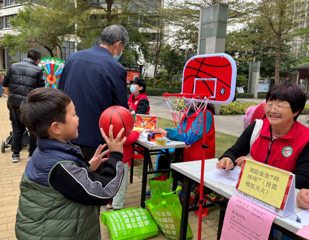 在消防安全知识摊位,孩子们对投篮模拟灭火游戏非常喜爱。家长们为孩子科普消防安全知识,孩子们则拿起篮球进行“灭火”投篮。