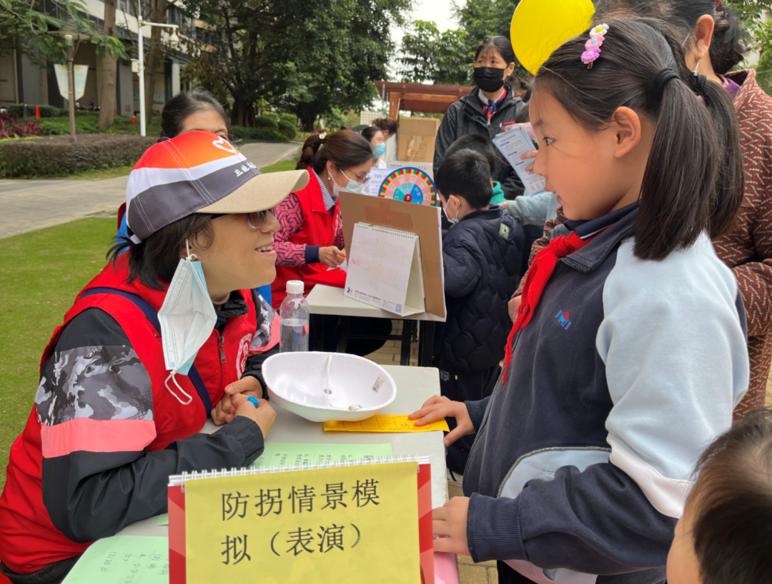 在防拐骗摊位,工作人员设置了模拟场景,让小朋友现场进行模拟体验。志愿者扮演“坏人”跟现场一位小朋友说:“我受伤了,能不能送我回家?”小朋友立马答应了下来。随后,志愿者指出其中的错误,并向大家讲述人贩子的伎俩,提醒大家注意防范。