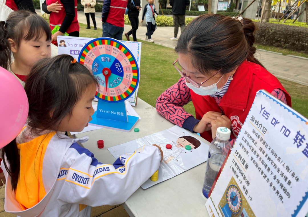在儿童性教育摊位,孩子们通过转动转盘,随机选取生活情景。在志愿者的引导下,孩子们思考不同情境下身体接触的界限,在人体图上,识别哪些部位可以触摸,哪些不可以。