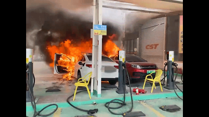 2022年4月,福建省莆田市一停车场内一辆新能源汽车在充电时突发火灾,并引燃旁边的另一辆汽车。