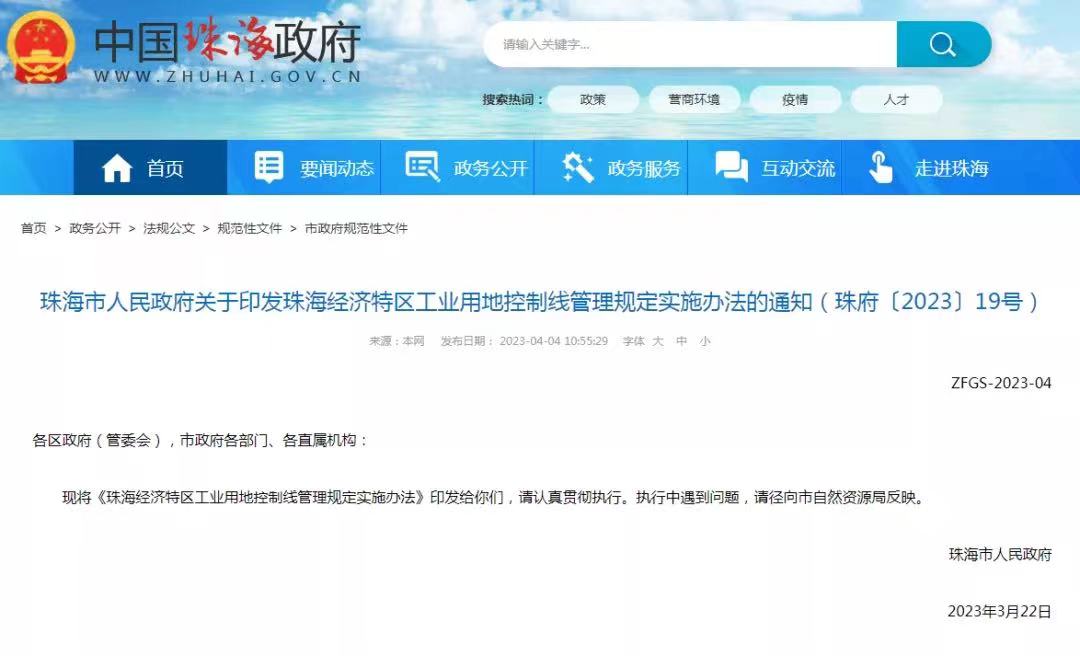 4日,珠海市政府官网对外发布《珠海经济特区工业用地控制线管理规定实施办法》(以下简称《实施办法》)。该《实施办法》从今年5月1日开始实施,鼓励在一级控制线范围内推进连片“工改工”,对全市工业用地控制线实行“一张图”动态更新和监管。