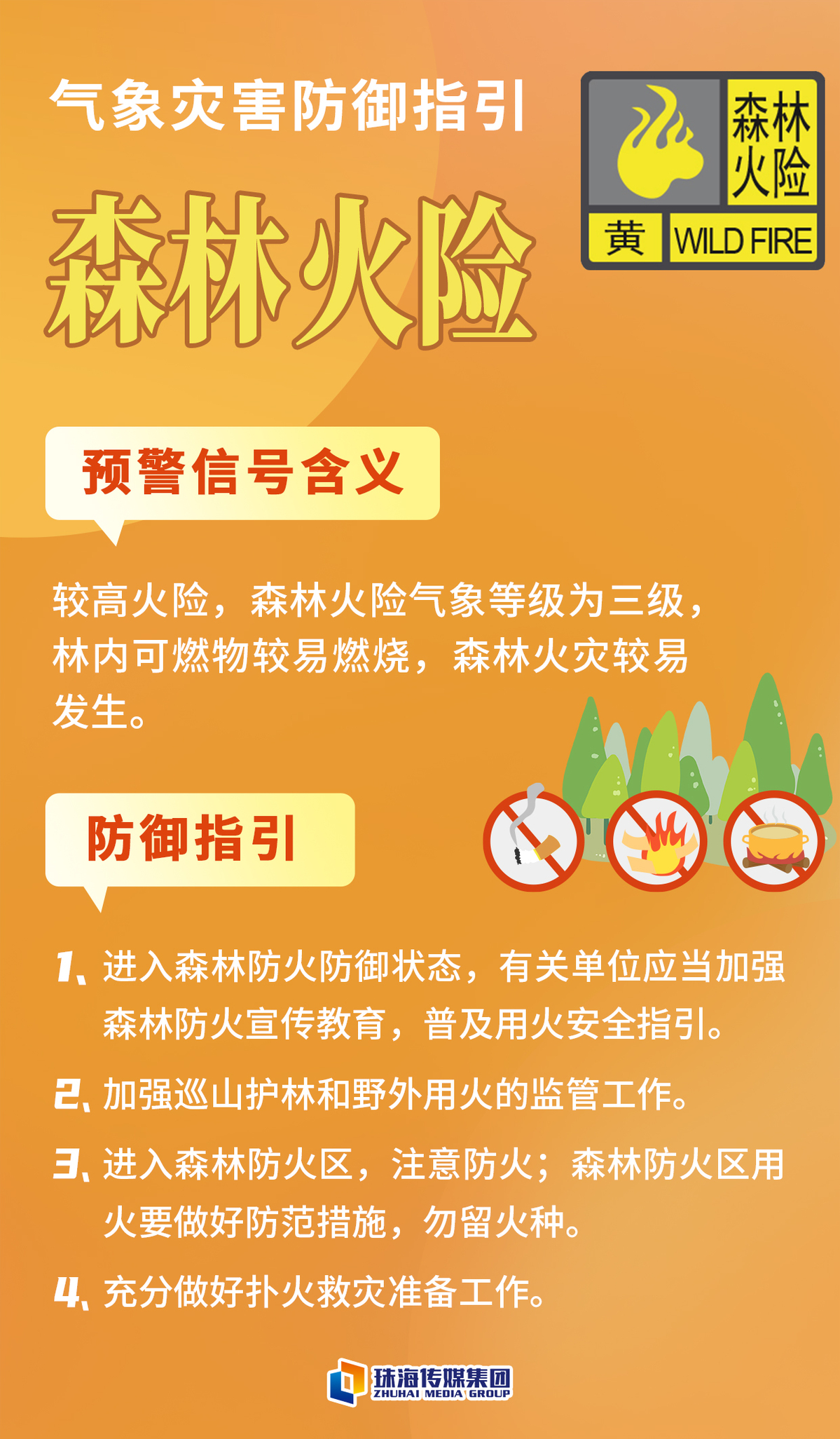 4月7日15时45分,据珠海气象台预计,未来几天我市天气较为干燥,森林火险气象等级较高,市气象台已发布全市森林火险黄色预警信号,请做好森林防火工作,并注意居家用火安全。