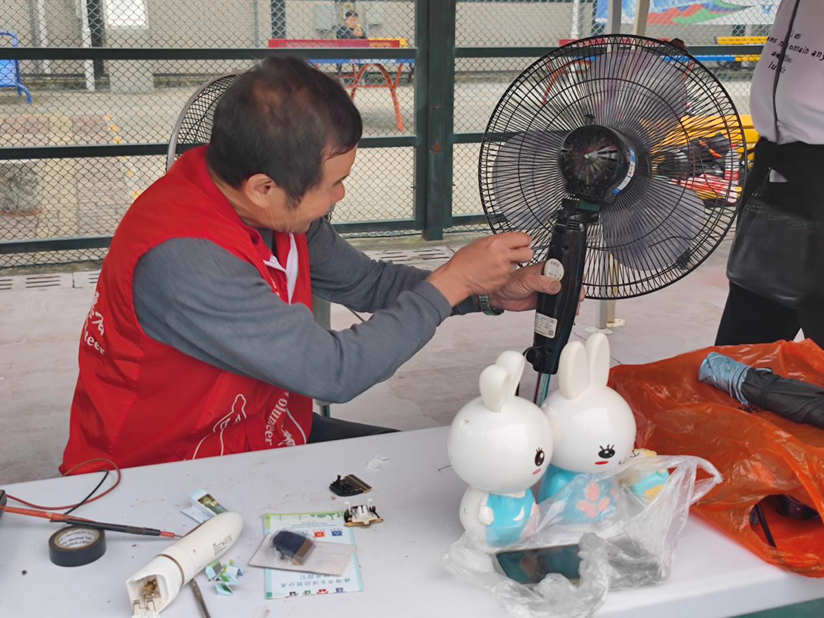 活动现场,最受欢迎的当属家电维修摊位。社区居民听说可以免费维修家电,纷纷从家中拿来存在故障的电风扇、电热水壶、电饭煲等小家电,让志愿者们“会诊”。志愿者仔细检查并耐心询问家电损坏的情况,细心地修理每一部小电器,竭尽所能为居民解决电器故障。