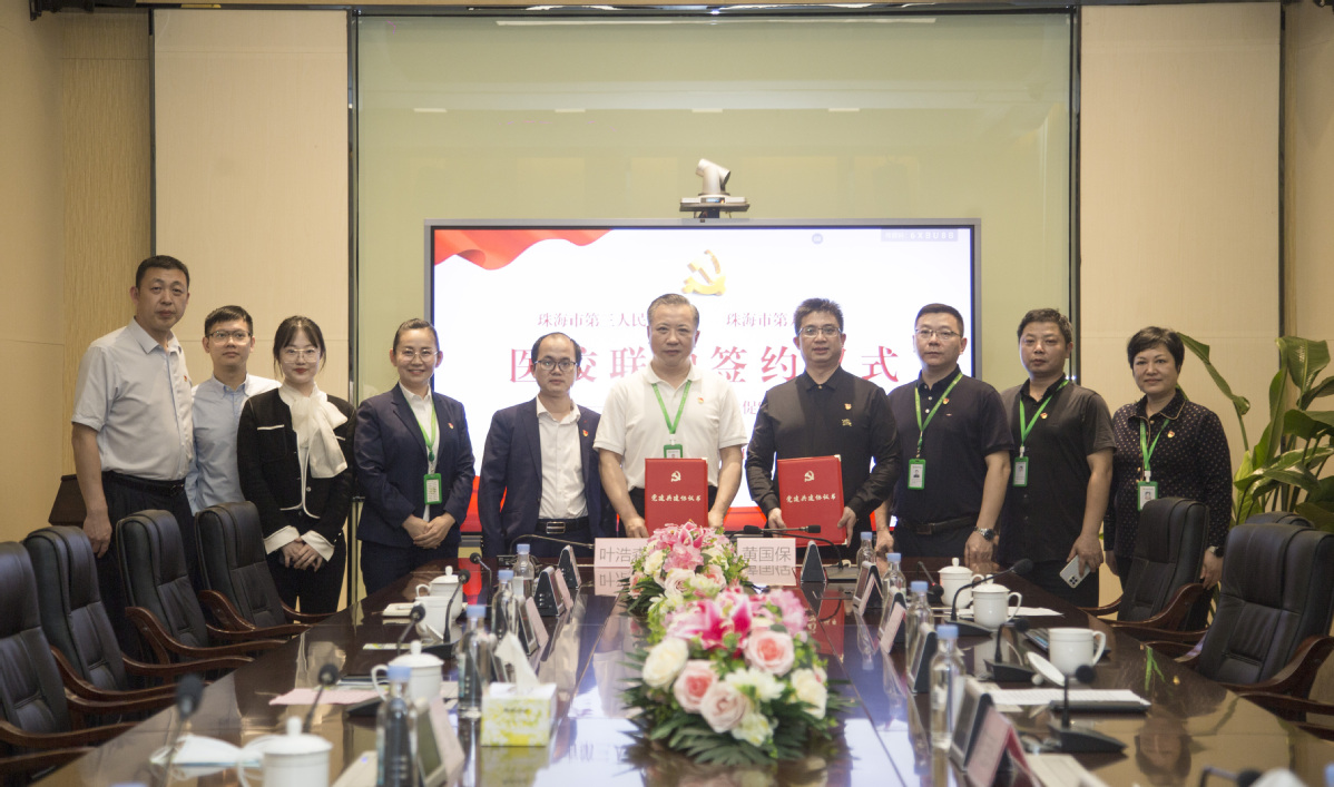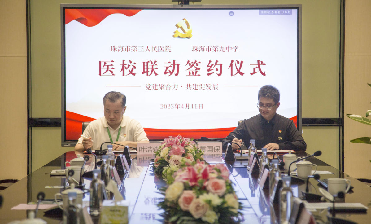 为持续推进家校医三维联动工作,共同护航青少年身心健康发展,4月11日下午,珠海市第三人民医院党委围绕“党建聚合力,共建促发展”主题,在市第三人民医院南屏主院区论道厅与珠海市第九中学党总支联合举行医校联动签约仪式。