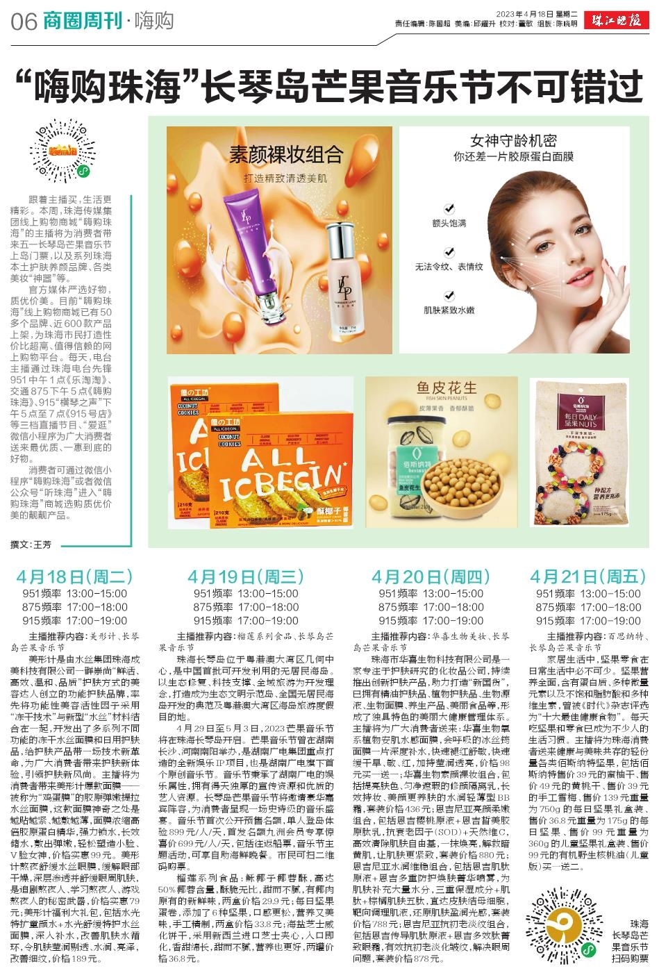 跟着主播买,生活更精彩。本周,珠海传媒集团线上购物商城“嗨购珠海”的主播将为消费者带来五一长琴岛芒果音乐节上岛门票,以及系列珠海本土护肤养颜品牌、各类美妆“神器”等。