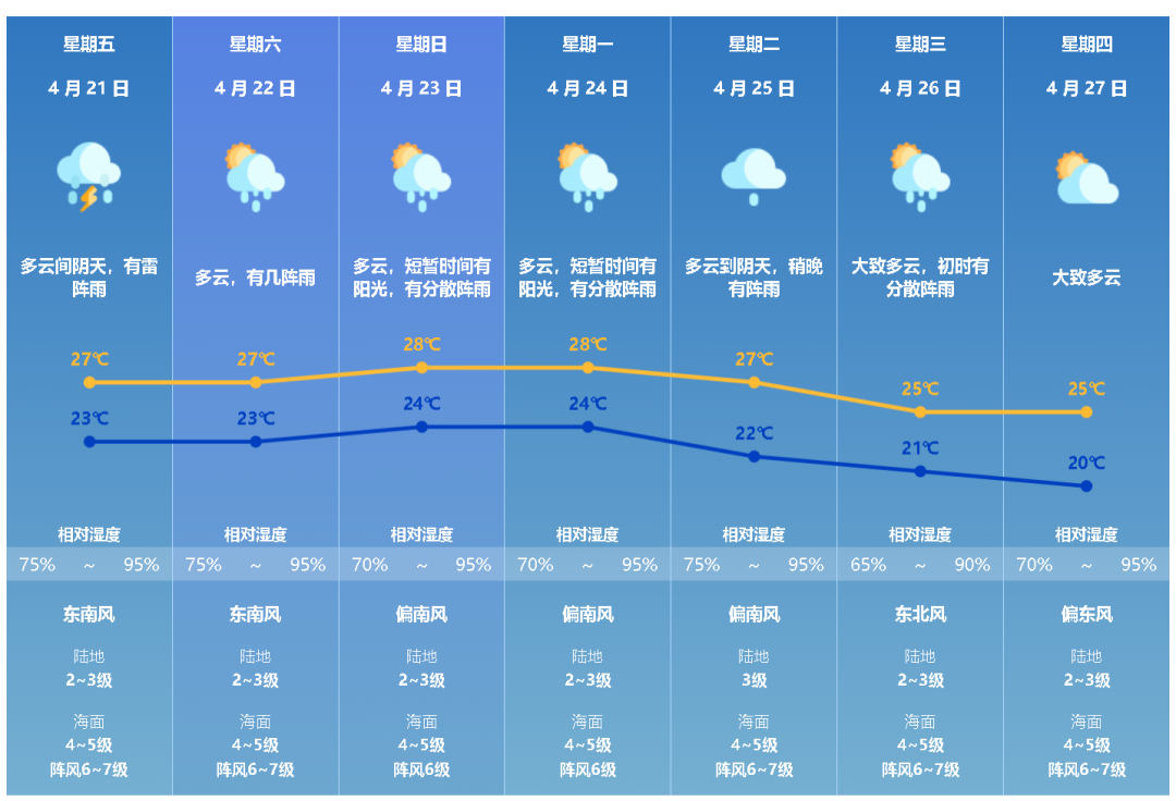 市气象台预计,今天珠海天气为阴天,有雷阵雨;22日仍有阵雨;23-24日多云,暂短时间有阳光,有分散阵雨;展望25-26日受冷暖气流交汇影响,有雷阵雨,早晚清凉。