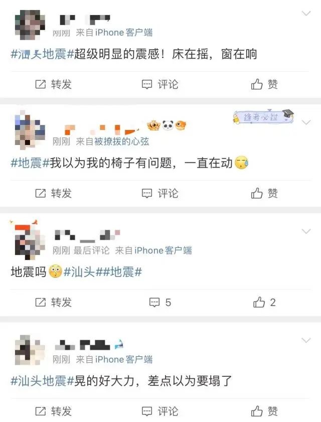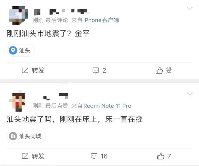 记者获悉,此次地震广东部分地区特别是潮汕地区有明显震感。微博上有人称自己在潮州,“在八楼感觉到明显摇晃”。