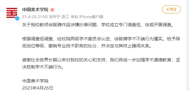 4月26日晚,@中国美术学院发布,关于该校教师徐跋骋作品涉嫌抄袭问题,学校成立专门调查组,依规开展调查。
