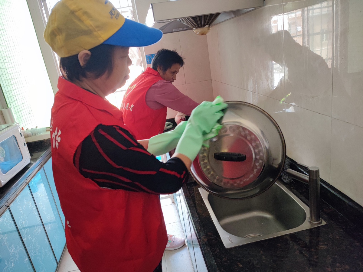 活动中,社工们发扬不怕脏、不怕累的精神,手持扫帚、抹布等工具,帮助长者打扫屋内卫生、清理厨房垃圾等,为长者创造干净、整洁、卫生的生活环境。