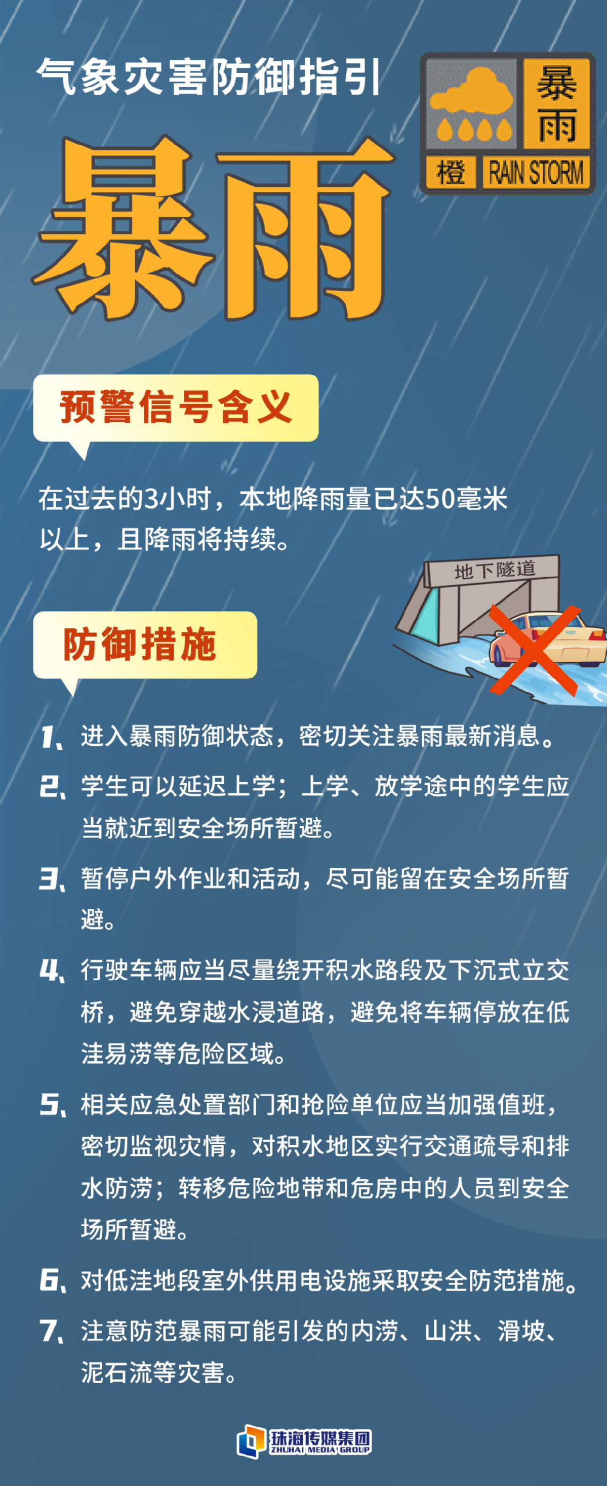 受强雷雨云系影响,我市已出现强降雨和短时大风。预计强降雨仍将持续,累积雨量将超过50毫米,并伴有9-10级短时大风,珠海市气象台5月7日13时00分已将暴雨和雷雨大风预警信号升级为橙色,请注意防御强降雨及其引发的城乡内涝、山体滑坡等次生灾害,并防御雷雨大风造成的临时搭建物、厂房工棚、户外广告牌、树木等倒塌风险。