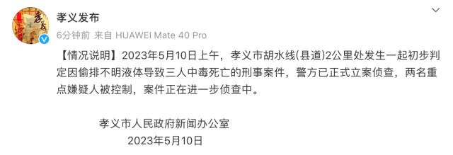 @孝义发布 微博消息,孝义市人民政府新闻办公室通报,5月10日上午,孝义市胡水线(县道)2公里处发生一起初步判定因偷排不明液体导致三人中毒死亡的刑事案件,警方已正式立案侦查,两名重点嫌疑人被控制,案件正在进一步侦查中。