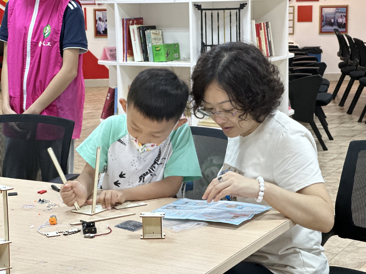 随后,在社工老师的示范指引下,孩子们与家长通力合作,开始组装电梯升降机模型:拼底座、装轿厢、连马达、通线路……在模型制作过程中,社工老师通过让青少年先思考后提问的教学模式,有效地调动他们对未知事物探索的主动性,让孩子们充分掌握机械的科学原理。