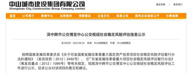 5月24日,中山城市建设集团有限公司发布“深中跨市公交博览中心公交枢纽社会稳定风险评估信息公示”,就项目社会稳定风险评估工作进行公示,征求公众对该项目的意见和建议。公示信息显示,深中跨市公交博览中心公交枢纽位于中山市博爱六路南侧的中山市博览中心西北角,拟新建一座公交枢纽站,对接深中跨市公交线路。项目预计2023年11月动工,2024年2月底建成投入使用,施工工期为110天。